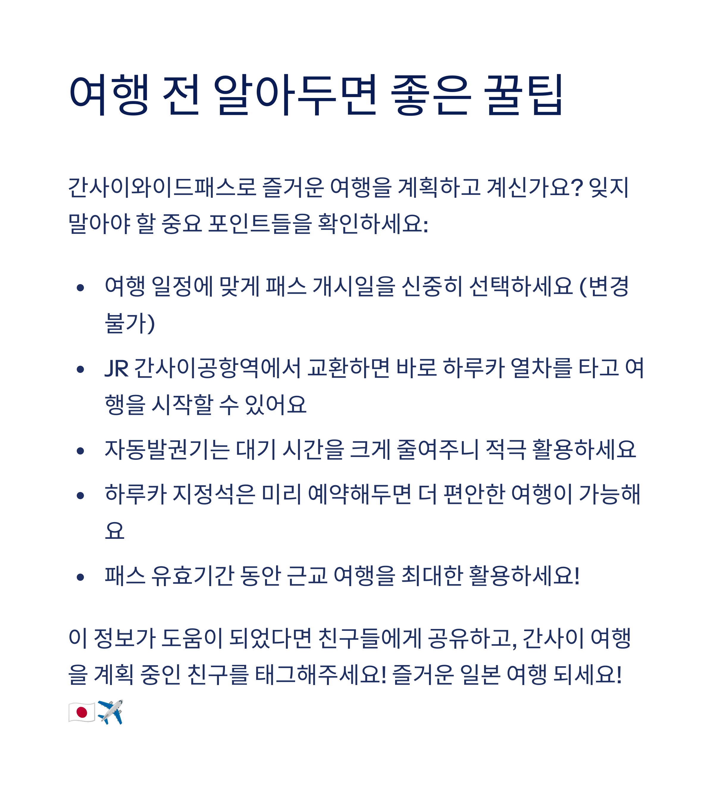 하루카 열차의 예약 과정을 이해하면 공항에서 도시로의 이동이 더욱 편리해집니다. 이용 구간과 조건을 미리 검토하면 교통 패스의 최대 활용이 가능합니다. 이번 가이드를 바탕으로 더욱 즐겁고 효율적인 일본 간사이 여행을 계획해보세요.
