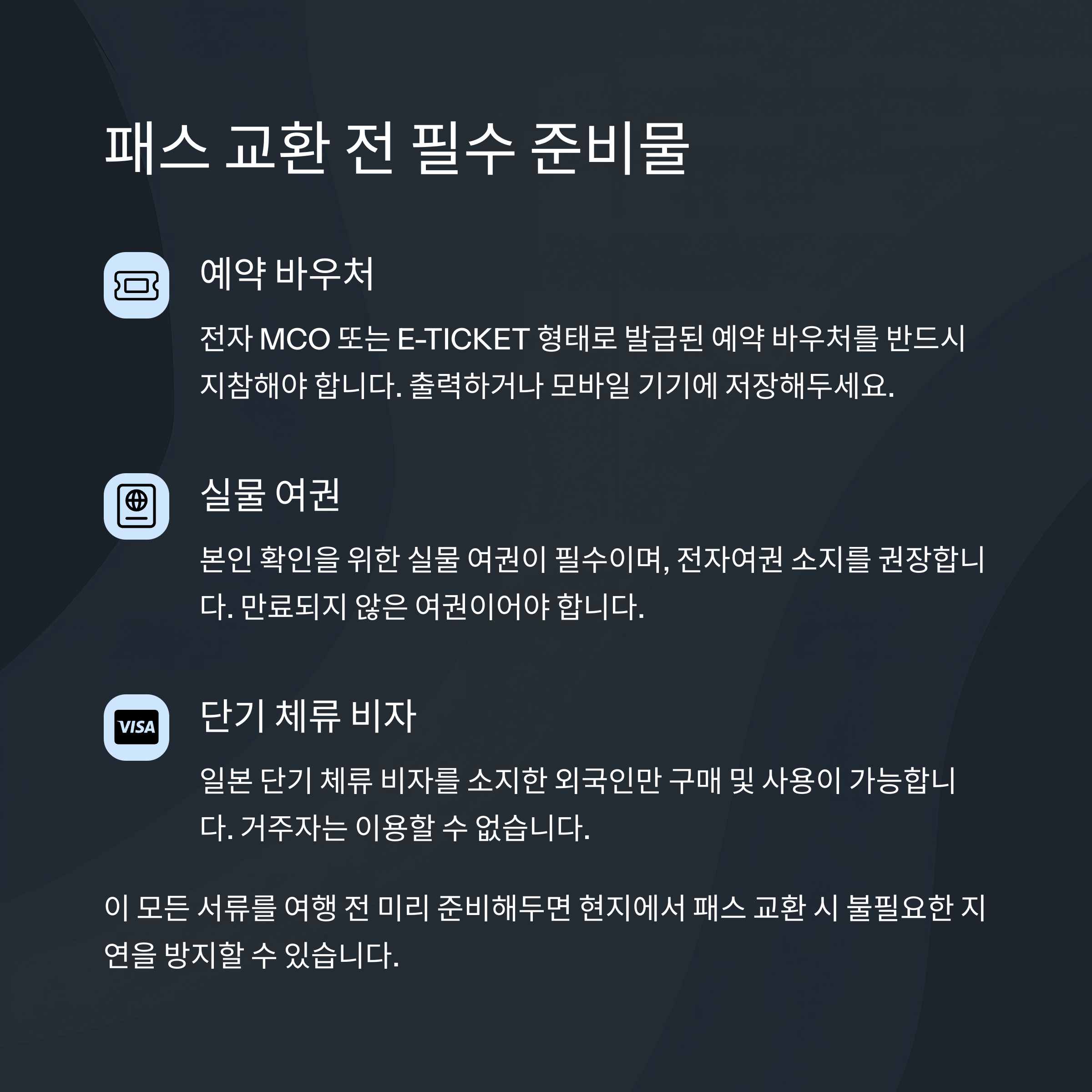 JR 창구를 통해 교환하려면 여권과 E-티켓 바우처를 지참하여 직원에게 제출하면, 간단한 서류작업 후 패스를 받을 수 있습니다. 반면, 자동 발권기에서는 QR 코드를 스캔하여 스스로 교환 과정을 완료할 수 있습니다. 이 과정에서는 여권 스캔, 시작일 선택, 티켓 출력이 포함되며, 교환 시간이 비교적 빠른 편입니다.