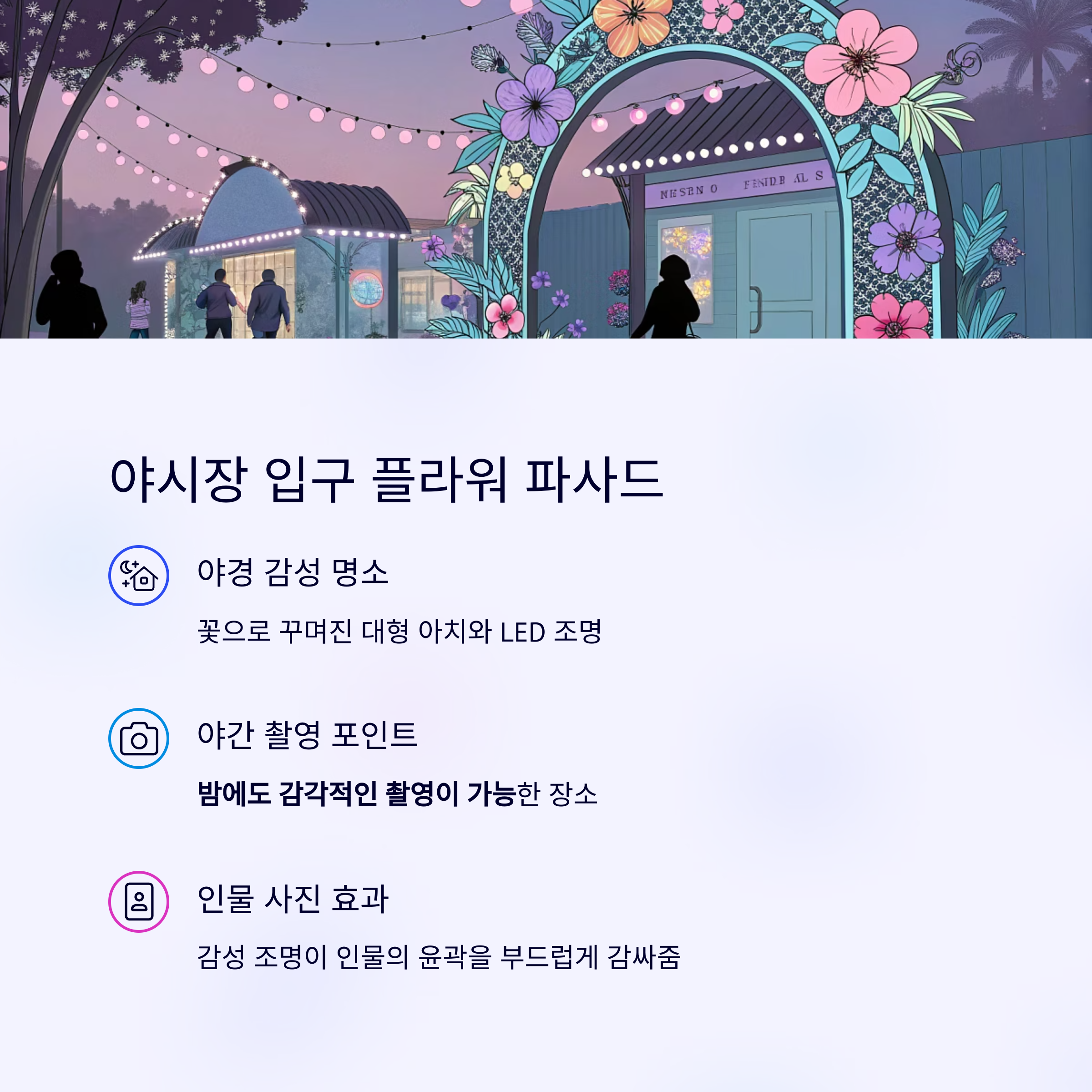 야시장 입구 플라워 파사드 – 야경 감성 명소