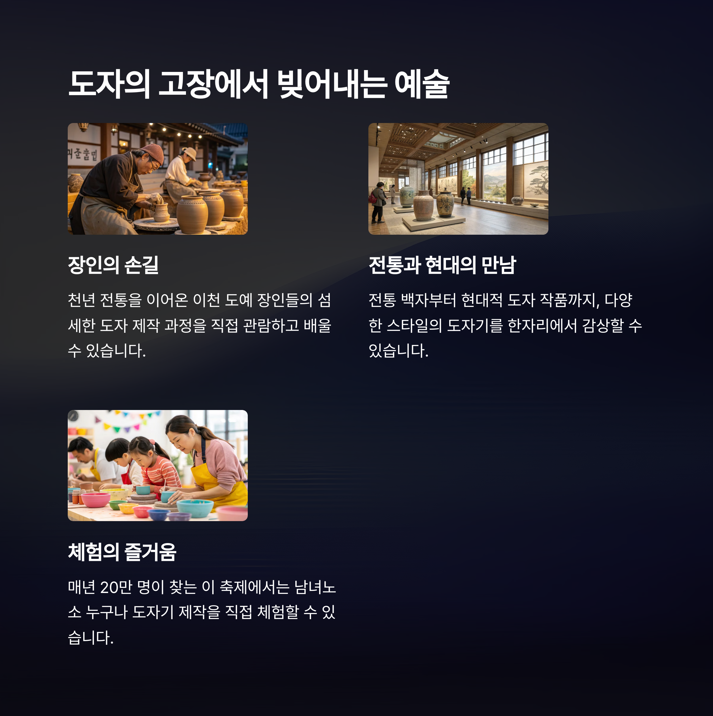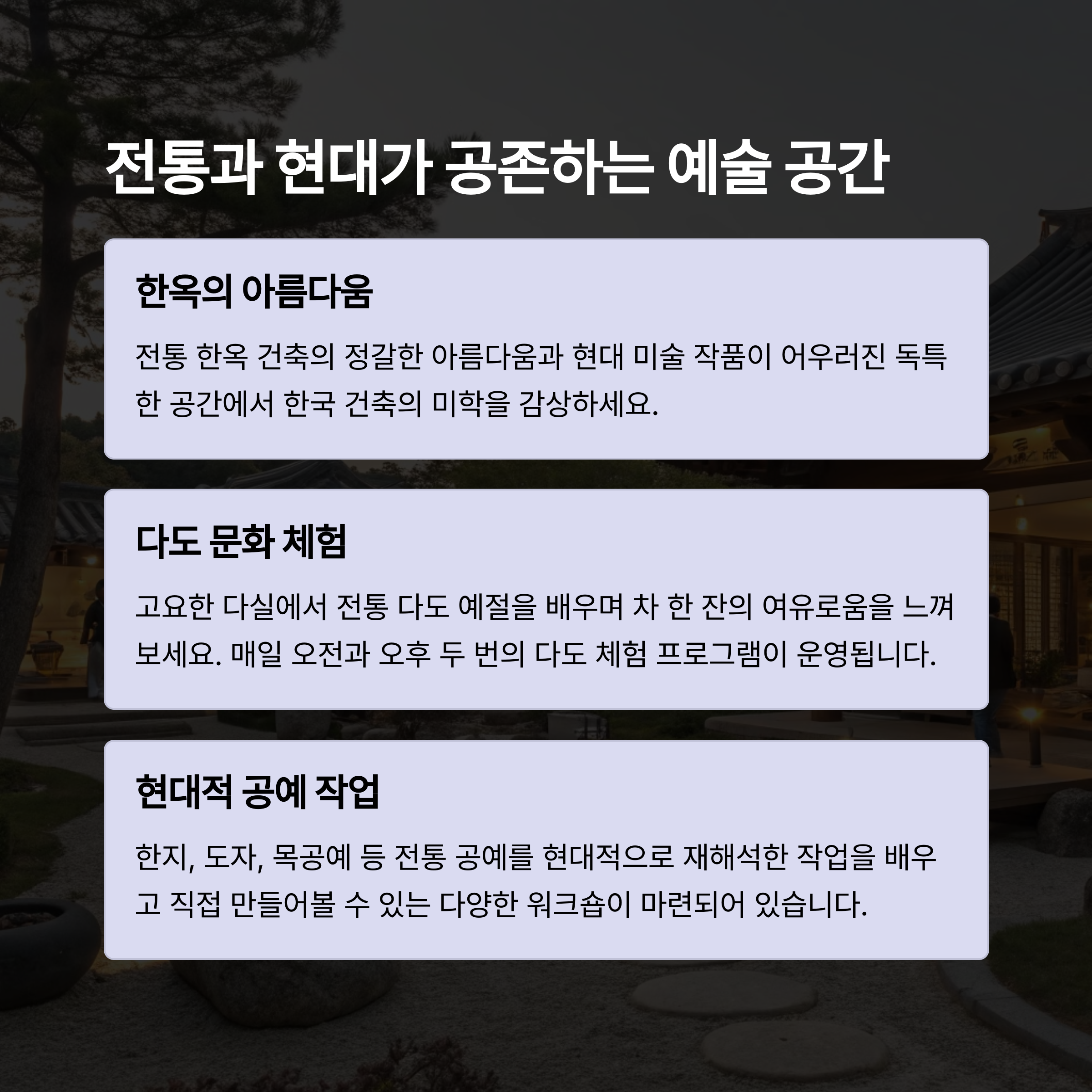 | 전통 가옥·공예·공연 체험 | 도자기 제작·페인팅 체험 | 한옥과 현대 미술 융합 체험 |