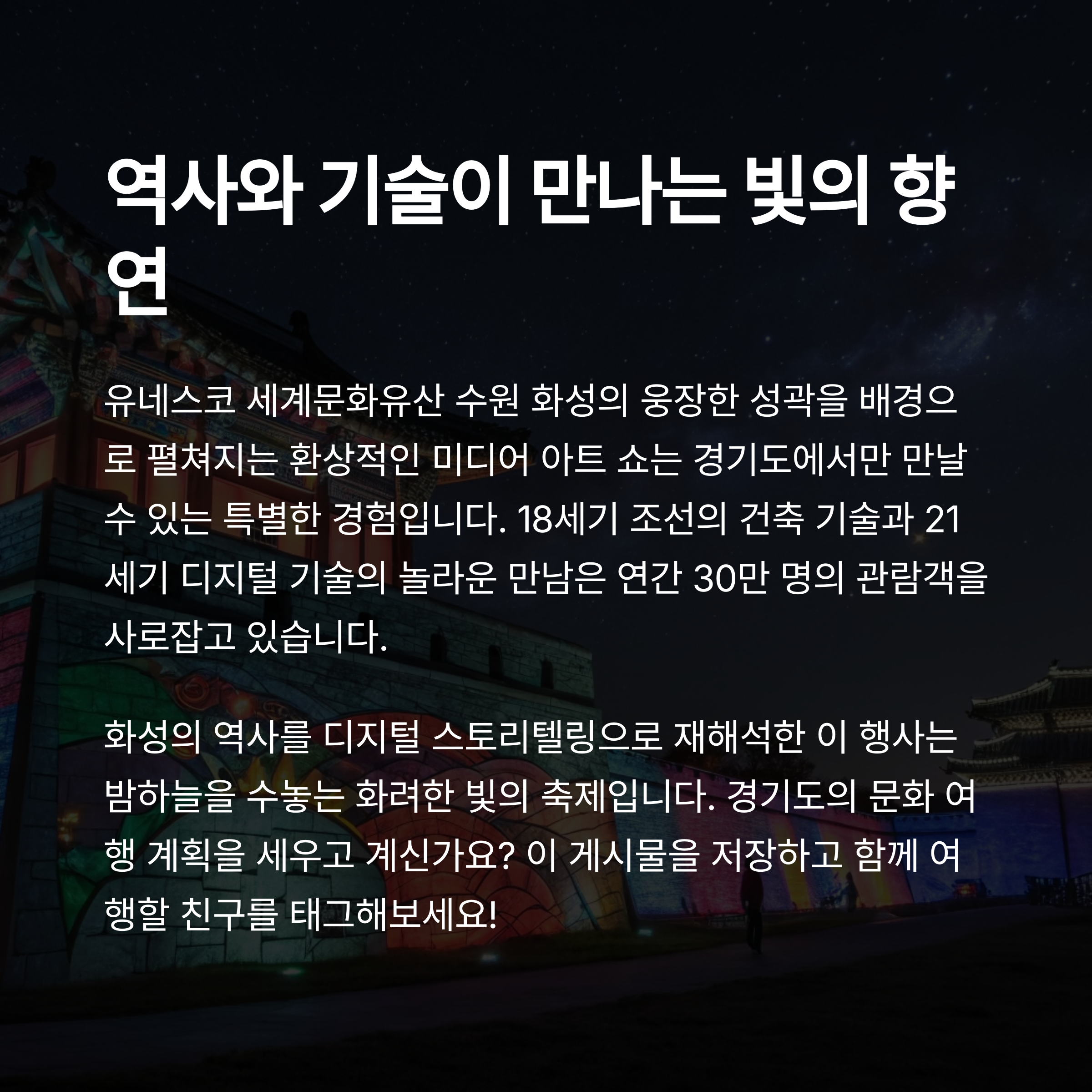 경기도는 전통과 현대가 조화를 이루는 특별한 여행지입니다. 이 지역은 역사적인 유산과 현대적인 감각이 결합된 문화 체험을 제공하여, 다양한 여행자들에게 독특한 경험을 선사합니다. 경기도의 문화 체험 장소들에서는 전통과 현대를 동시에 즐길 수 있습니다. 여행을 떠나기 전, 꼭 방문해야 할 경기도의 대표적인 문화 명소 5곳을 소개해드립니다.