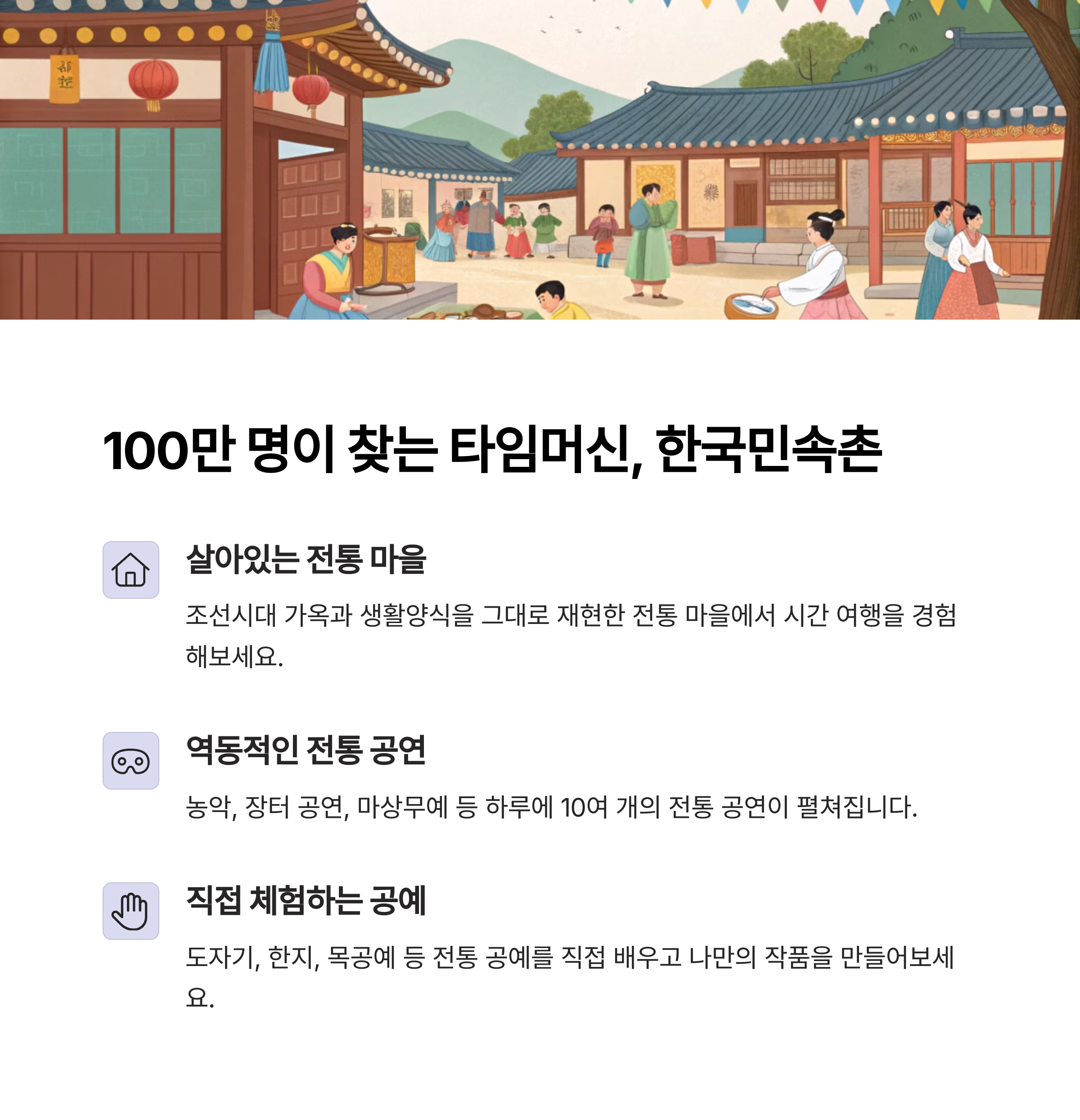 | 한국민속촌 | 전통 가옥과 공예 체험을 제공하는 살아있는 박물관 |