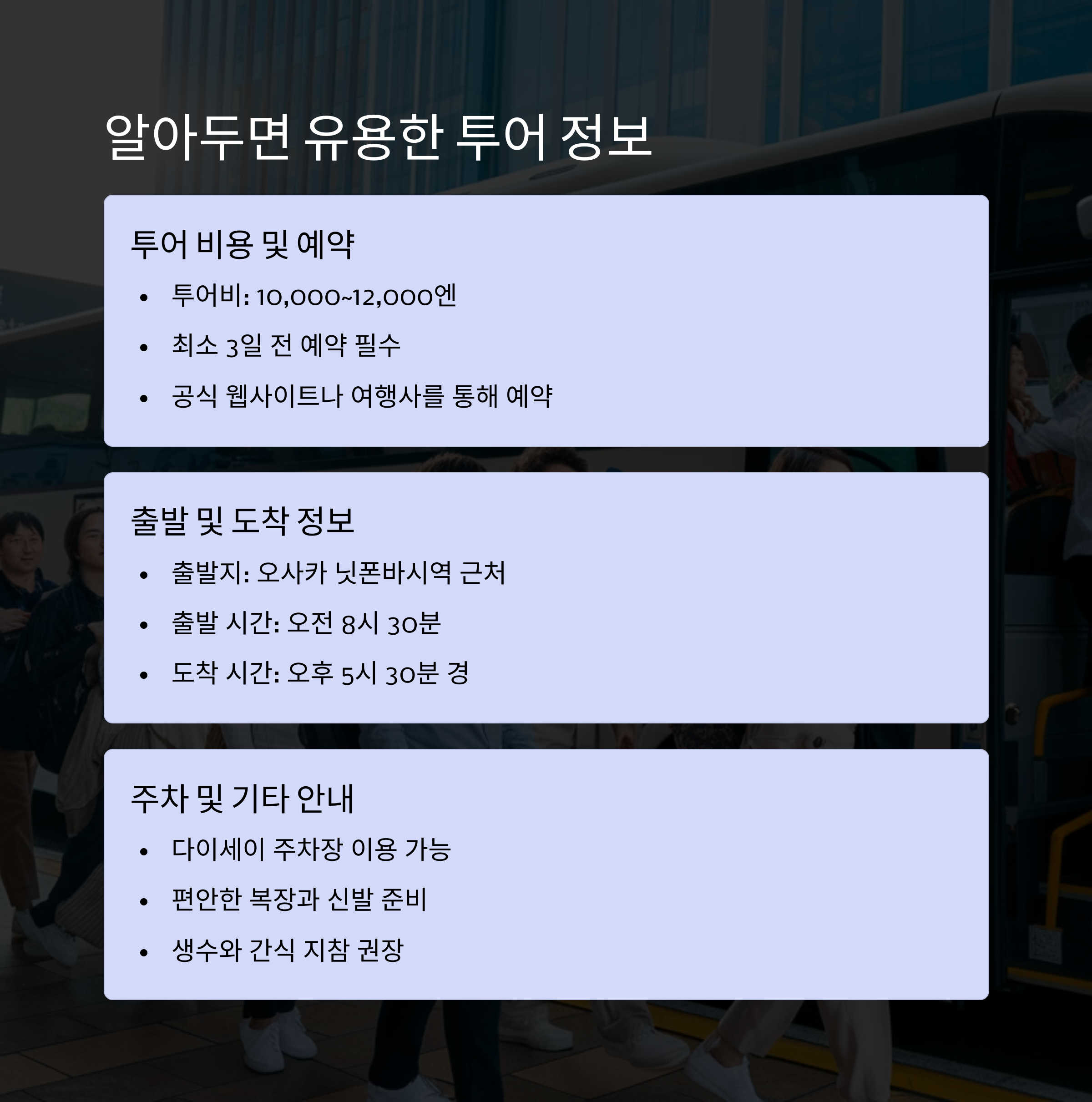 2. 투어 비용은 약 10,000~12,000 엔으로 투어 제공사에 따라 다를 수 있습니다.
