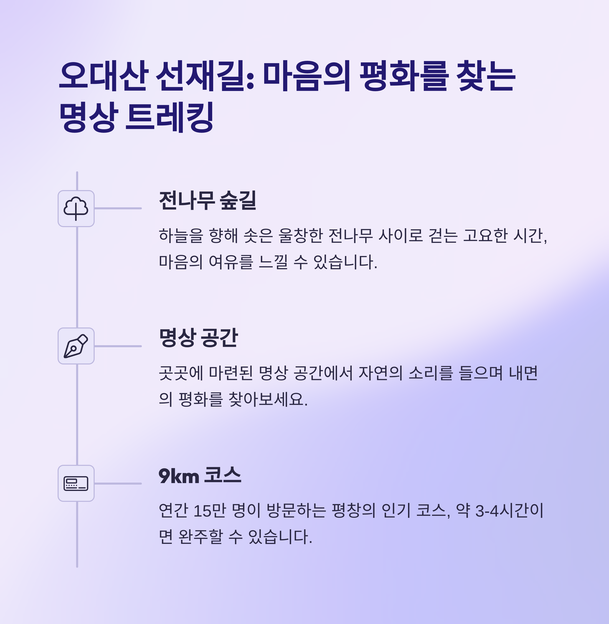 오대산 선재길은 전나무 숲과 청아한 자연이 돋보이는 수행의 길로, 월정사에서 상원사까지 이어지는 약 9km의 코스입니다. 이곳은 명상 공간도 마련되어 있어 힐링과 명상을 동시에 경험할 수 있습니다. 연간 약 15만 명이 이곳을 방문하여 깊은 여운을 남깁니다.