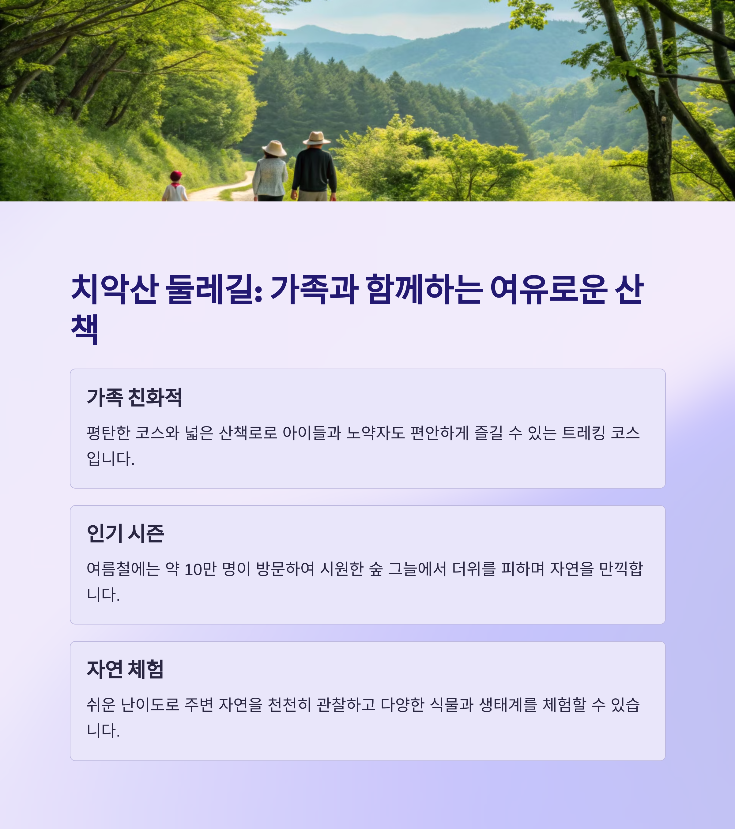 치악산 둘레길은 평탄하고 쉬운 코스로, 가족 단위 여행객에게 특히 인기가 많습니다. 약 6km 길이의 코스는 국형사주차장에서 시작하여 관음사, 제일참숯으로 이어집니다. 계곡과 숲길을 따라가며, 아름다운 전망을 제공하는 포인트들이 곳곳에 있습니다. 여름철에는 약 10만 명의 방문객들이 이곳을 찾습니다.