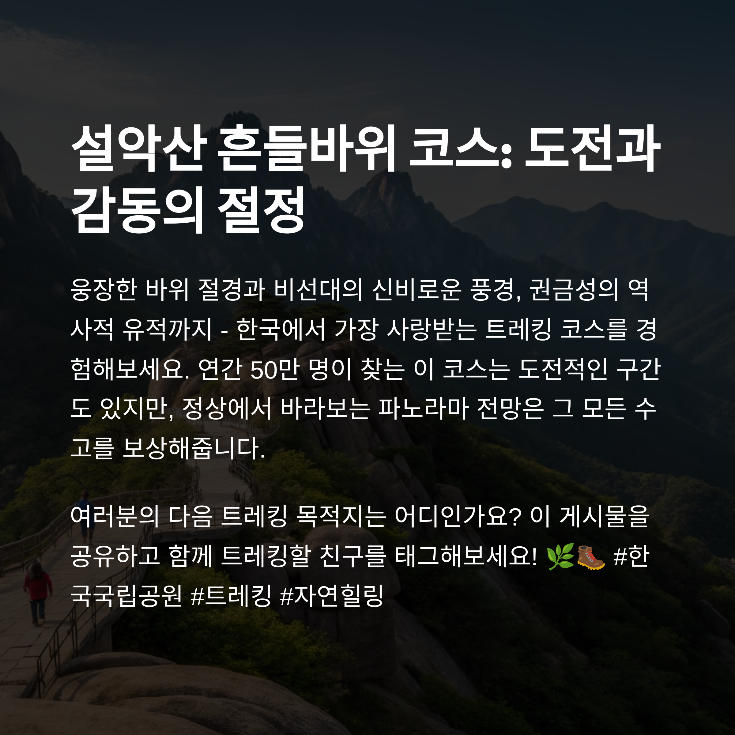 설악산 흔들바위 코스는 설악산의 대표적인 트레킹 코스로, 비선대와 흔들바위를 지나 권금성까지 이어집니다. 이 코스는 약 3시간 소요되며, 가을 단풍철에 특히 인기를 끌고 있습니다. 케이블카를 이용해 빠르게 오를 수 있어, 편리하면서도 자연을 가까이에서 만끽할 수 있는 기회를 제공합니다. 연간 약 50만 명이 이 코스를 찾으며, 그 아름다움에 매료됩니다.