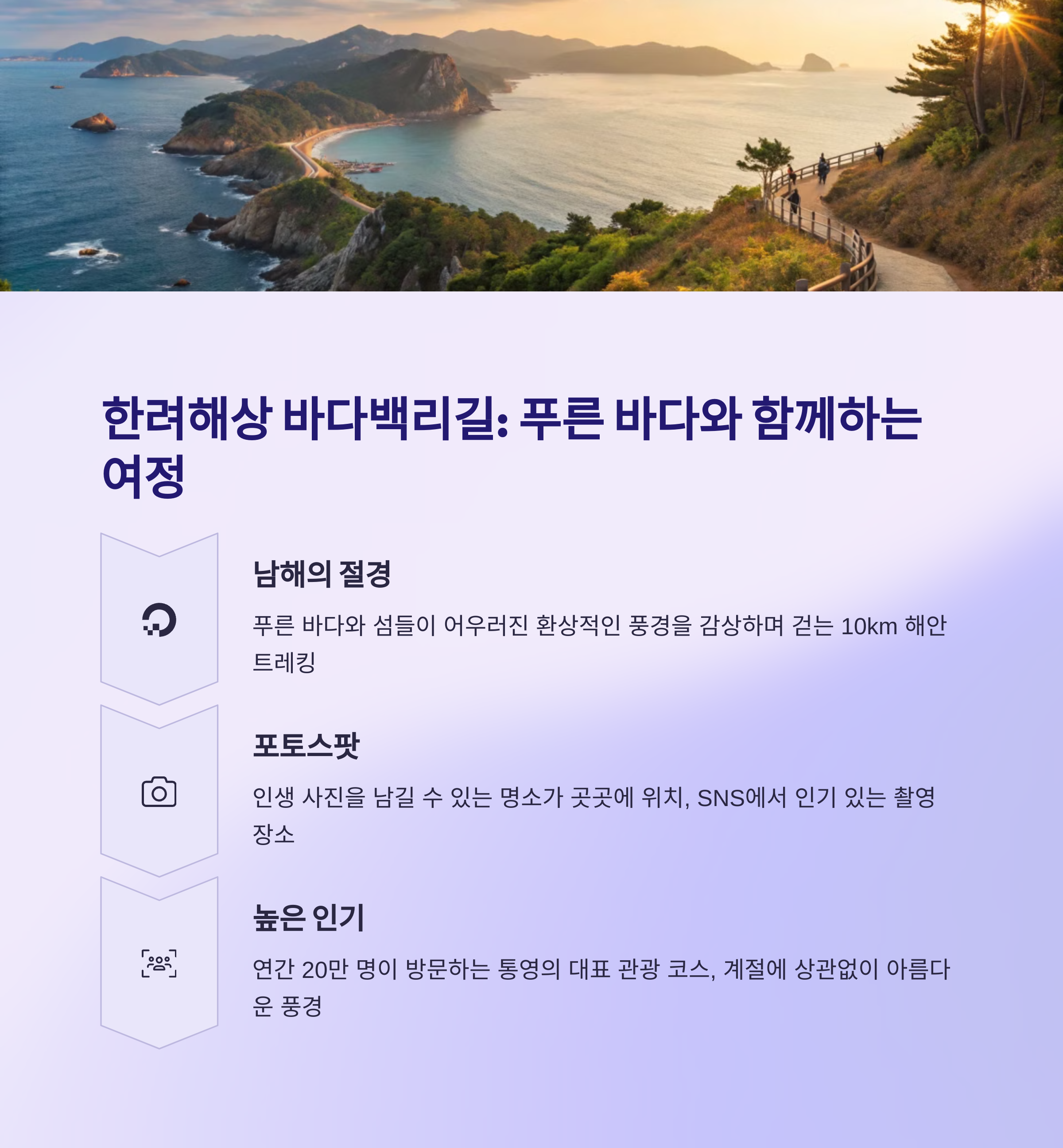 한려해상 바다백리길은 에메랄드빛 남해바다와 어우러진 절경을 감상할 수 있는 트레킹 코스입니다. 약 10km의 코스는 미래사에서 시작해 미륵산을 지나 야소마을과 달아전망대로 이어집니다. 미륵산 정상에서 한려수도의 파노라마 절경을 감상할 수 있으며, 이 지역의 아름다움은 많은 관광객들의 마음을 사로잡습니다. 연간 약 20만 명이 이곳을 방문하여 자연의 경이로움을 경험합니다.