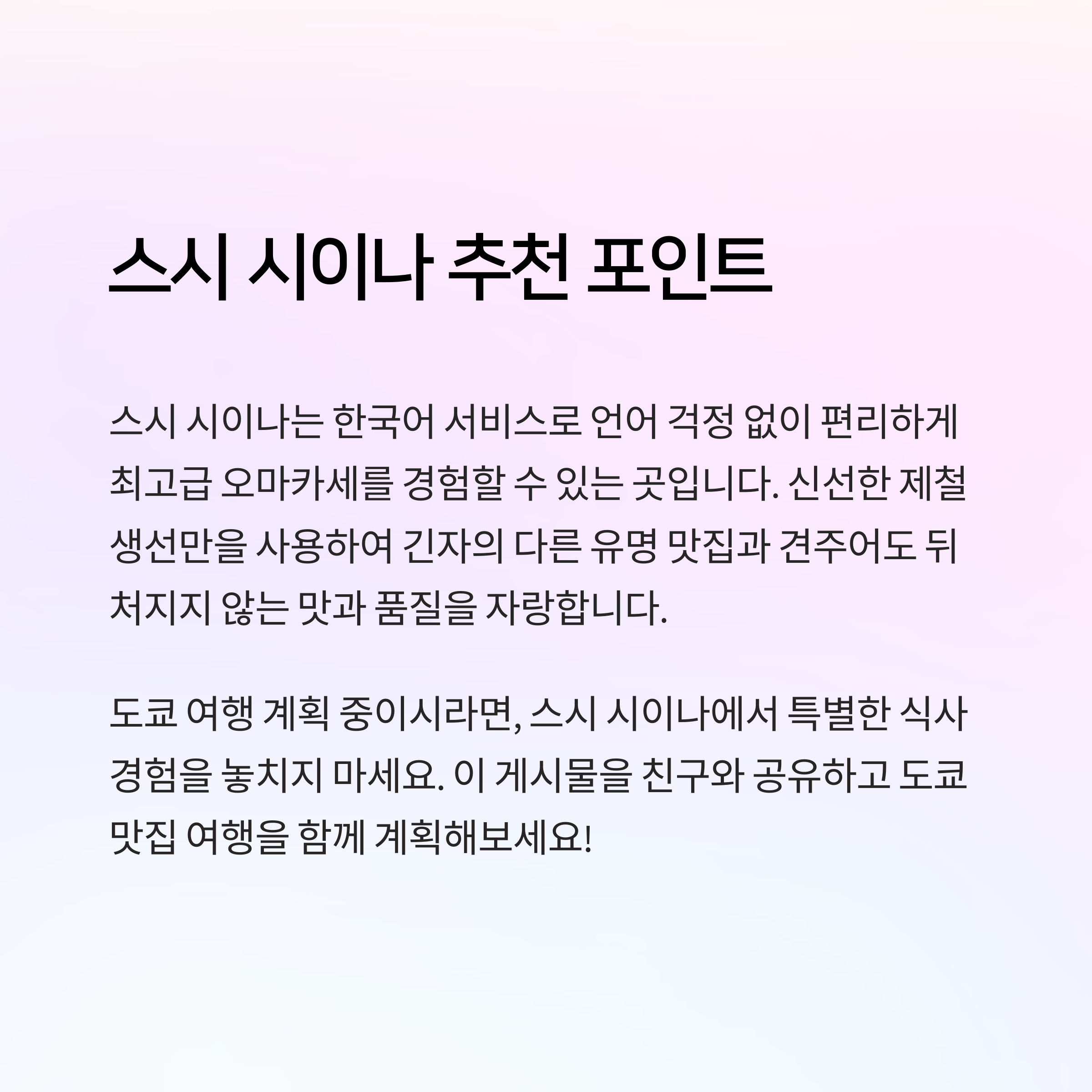 스시 시이나는 긴자의 고급 오마카세 맛집 중에서도 접근성, 가격, 그리고 서비스 다양성 측면에서 경쟁력 있는 선택지입니다.