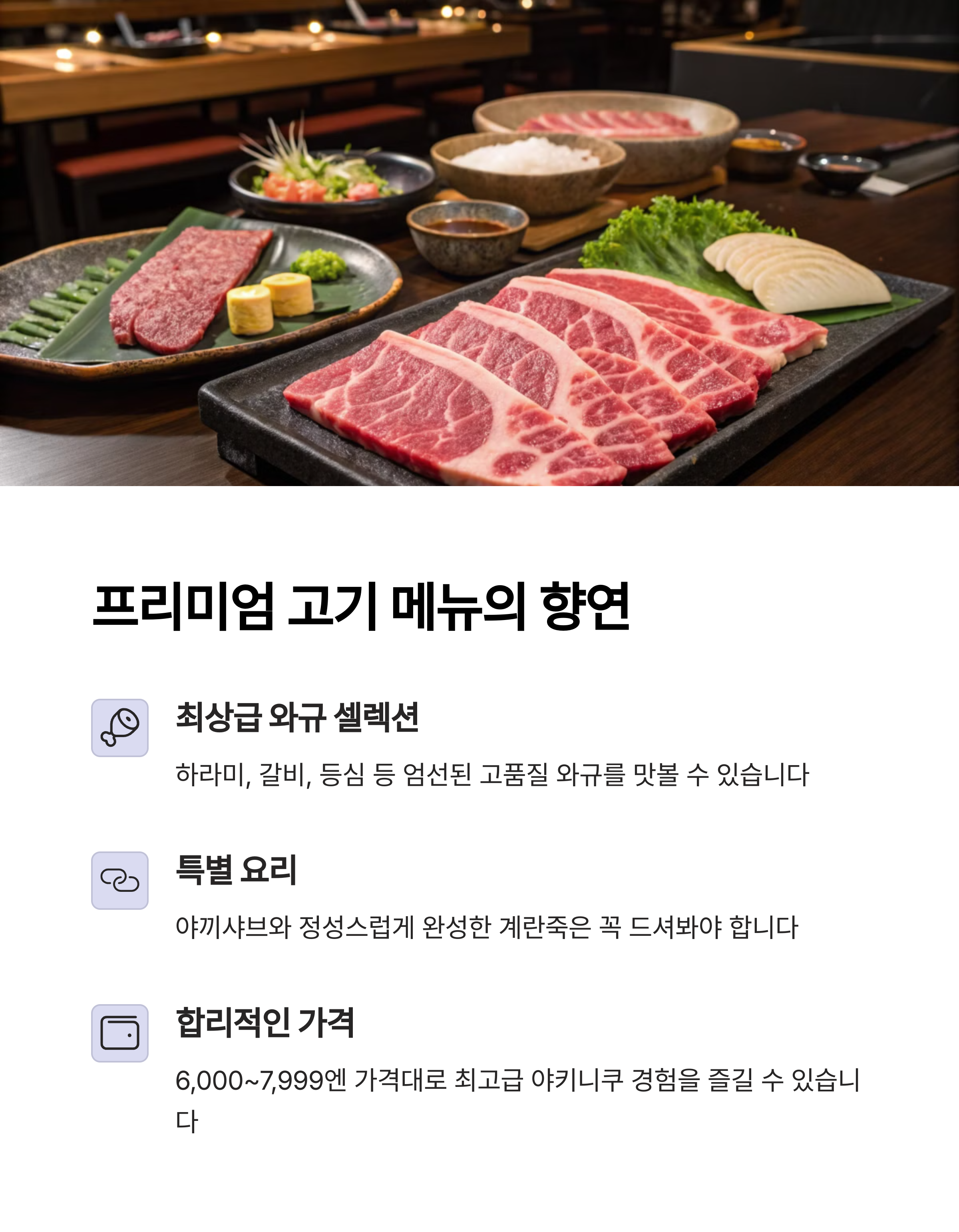 약 6,000엔 내외의 예산으로 놀라운 맛의 야키니쿠를 경험할 수 있어 다양한 연령층에 만족감을 주고 있습니다.