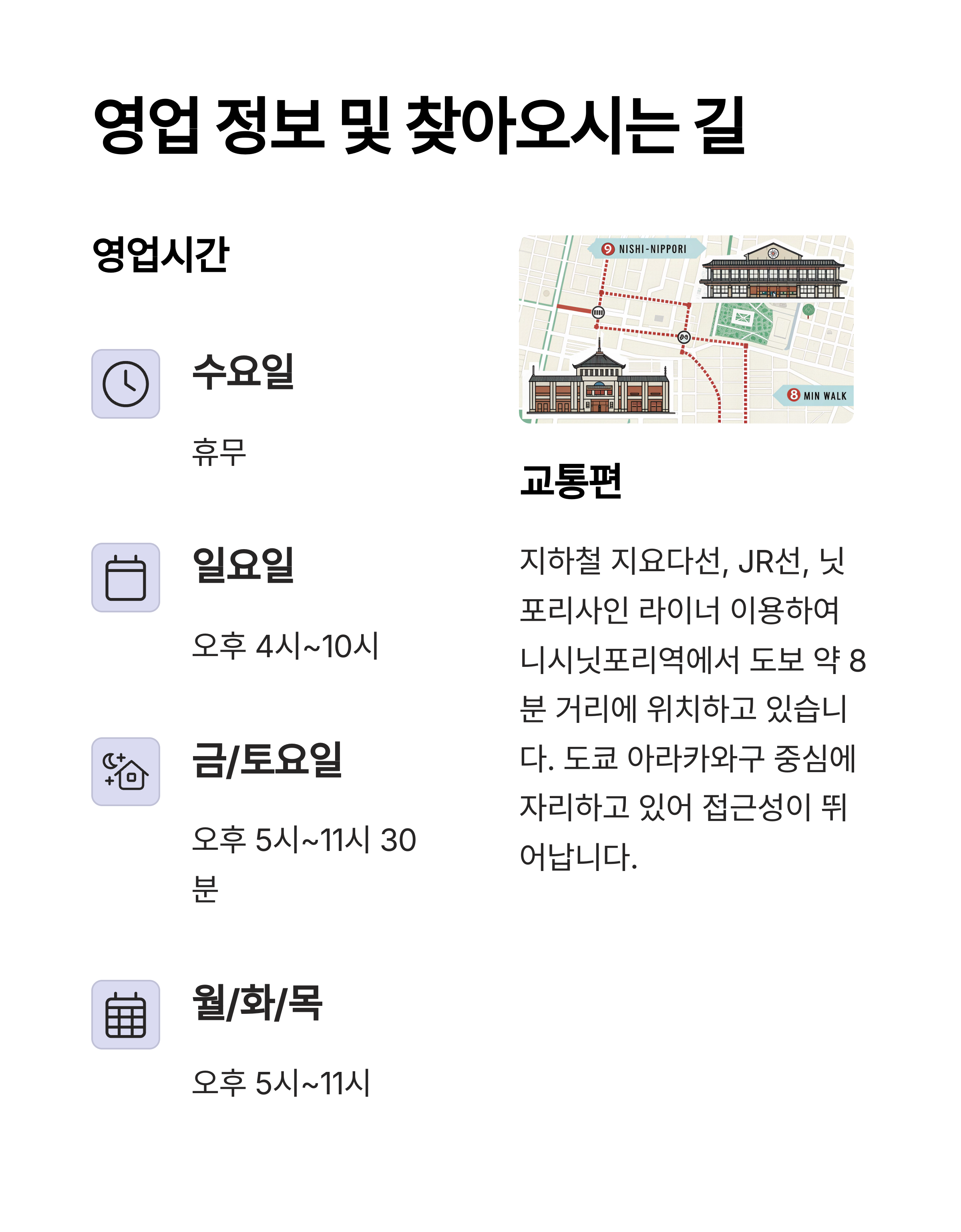 니시닛포리역에서 가까워 접근성이 뛰어난 것도 추천 이유 중 하나입니다.