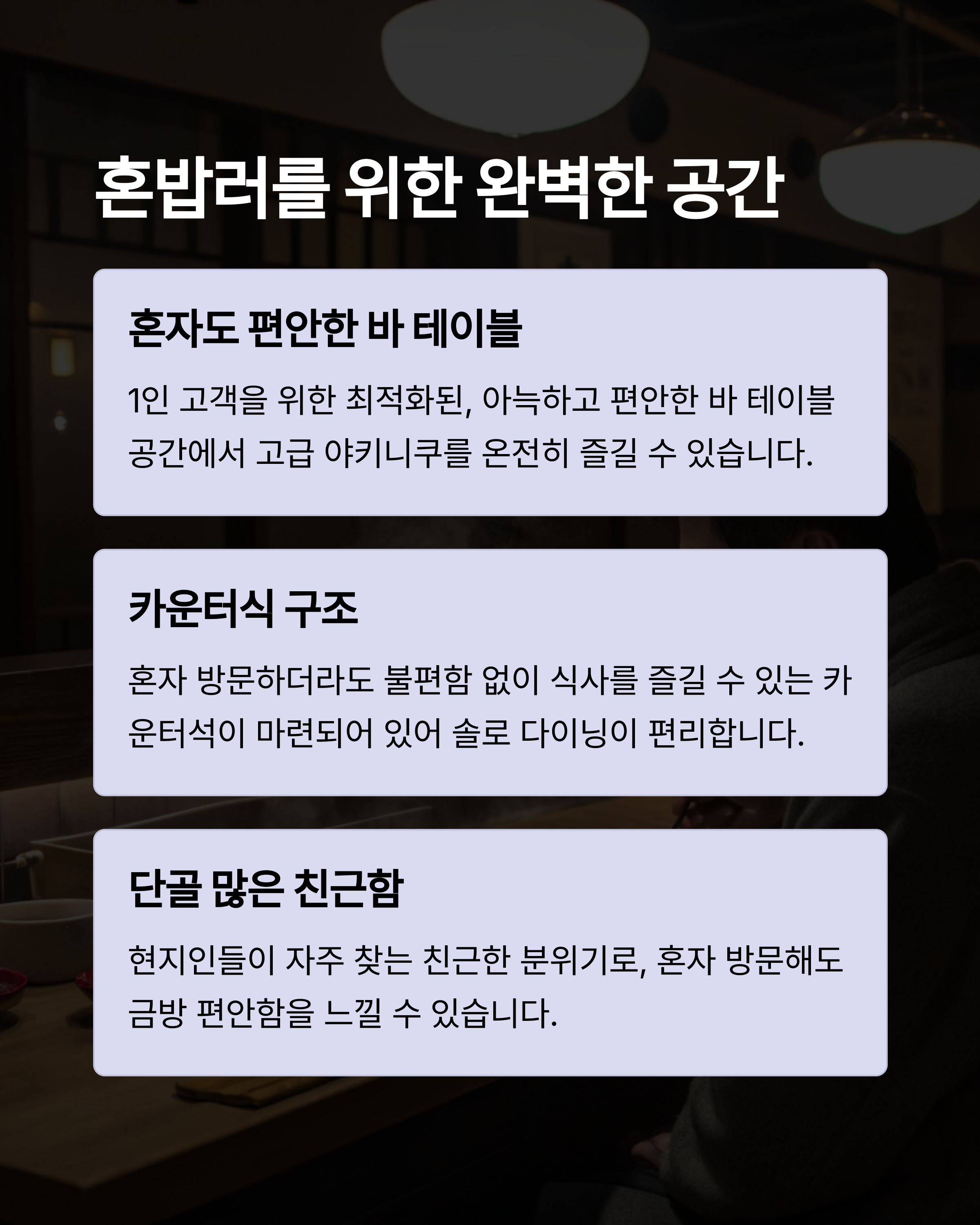혼밥이 가능한 바 테이블은 혼자 여행하는 분께 특히 이상적입니다.