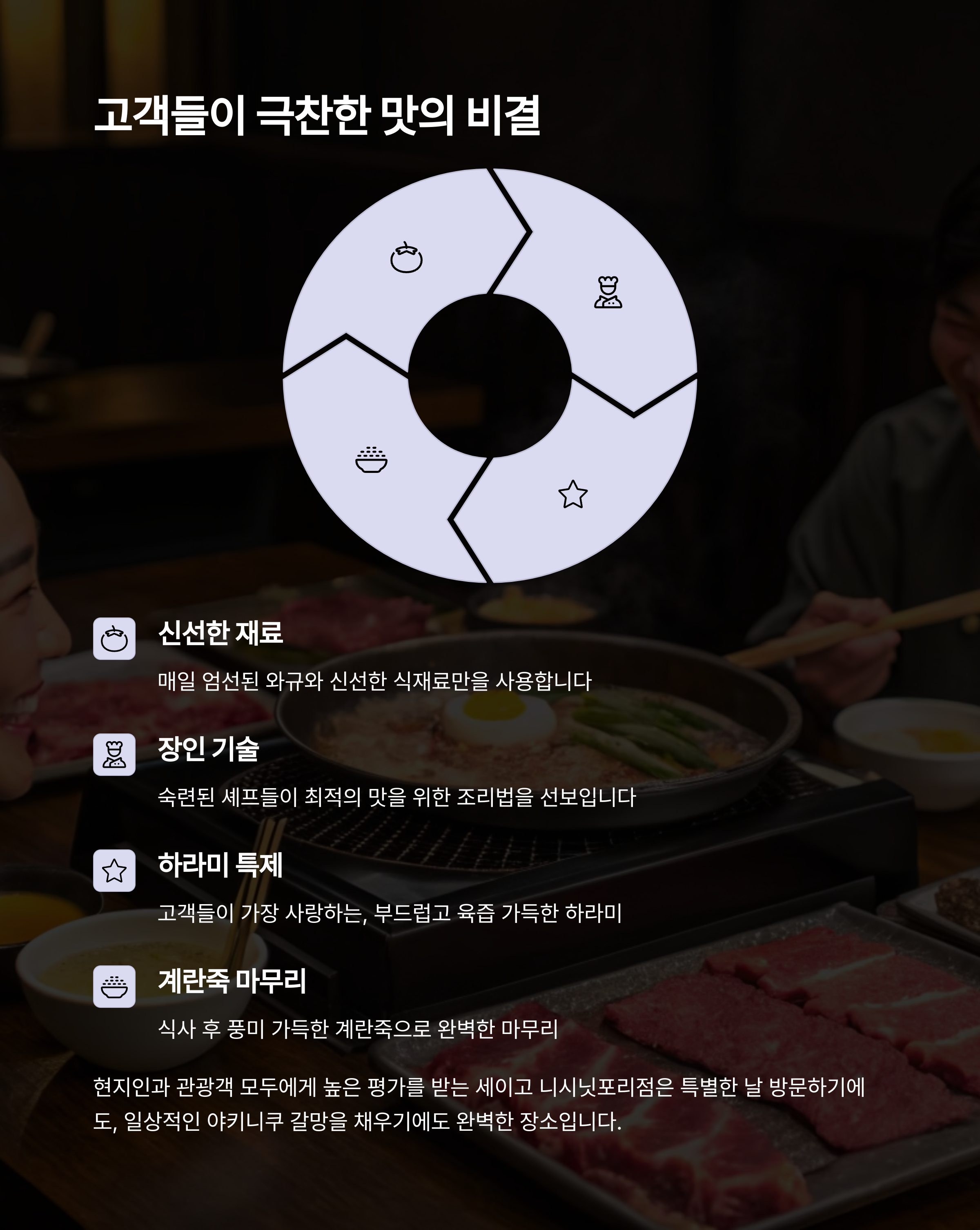 고기의 신선도와 품질은 물론, 정성스러운 조리가 음식을 더욱 특별하게 만듭니다.