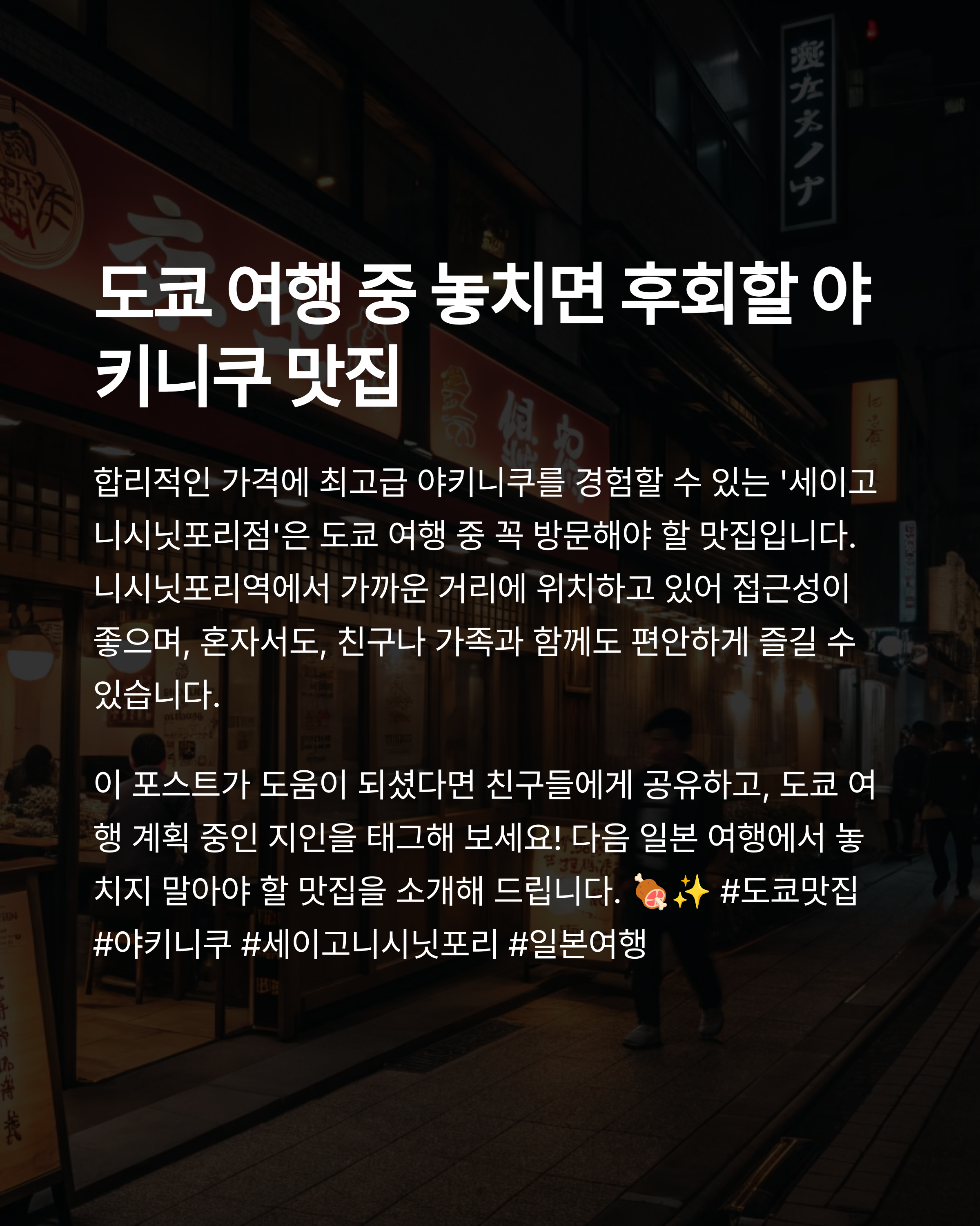오늘은 도쿄 니시닛포리역 근처에서 화제가 되고 있는 야키니쿠 맛집, '세이고 니시닛포리점'을 소개합니다.