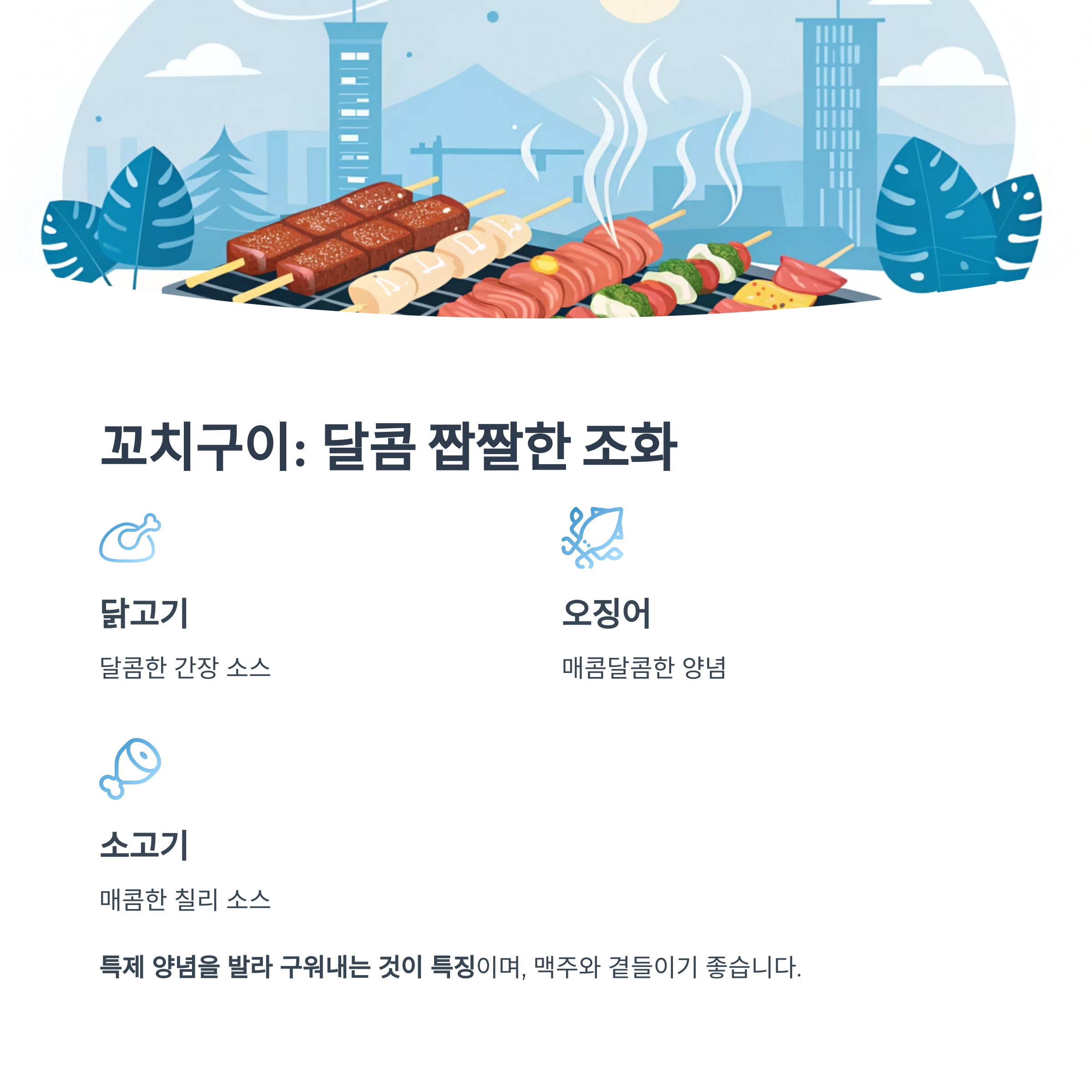 돼지고기, 닭고기, 해산물 등 다양한 재료에 특제 양념을 발라 구워내는 것이 특징입니다.