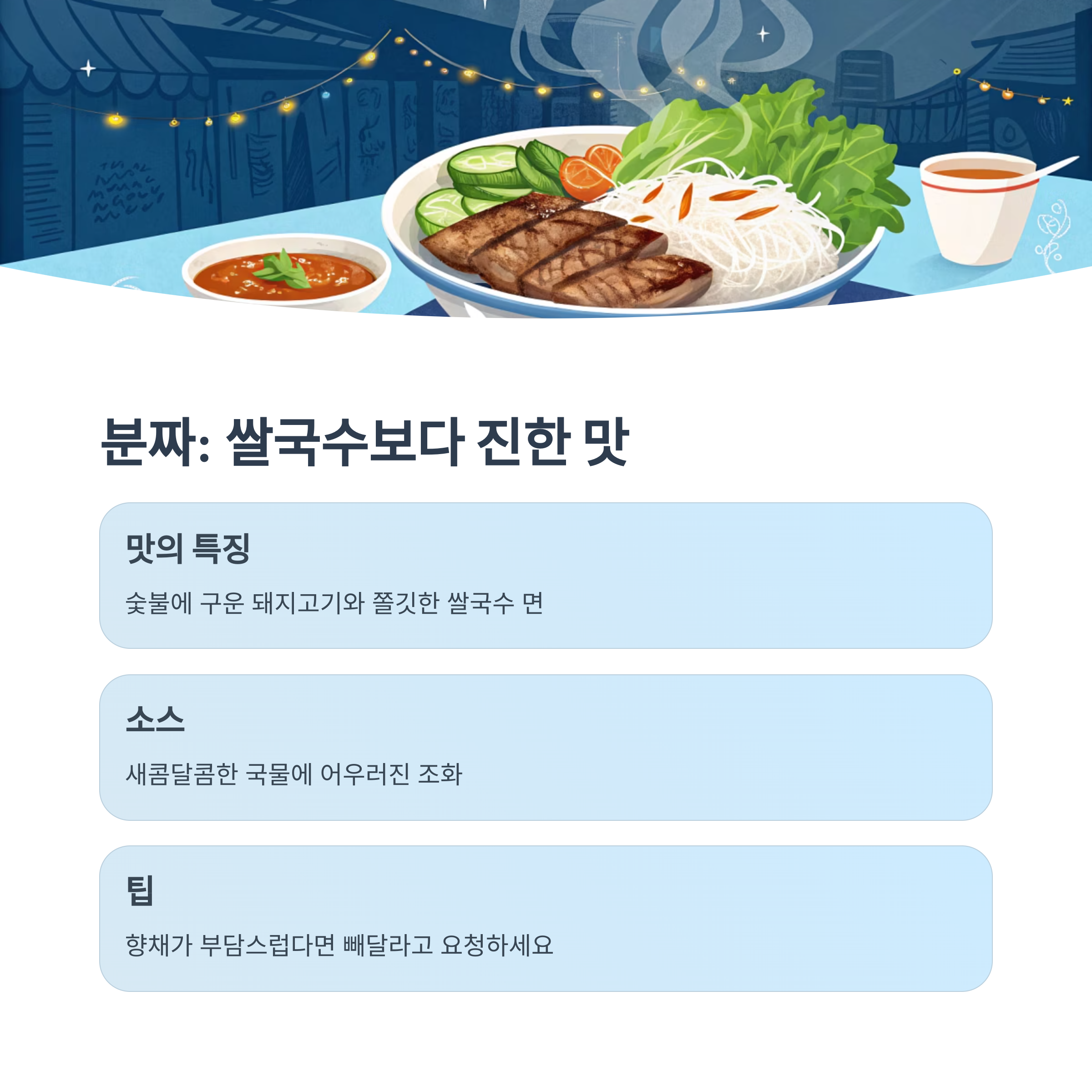 숯불에 구운 돼지고기와 쫄깃한 쌀국수 면이 새콤달콤한 국물에 어우러진 이 메뉴는 한국인 입맛에도 찰떡입니다.