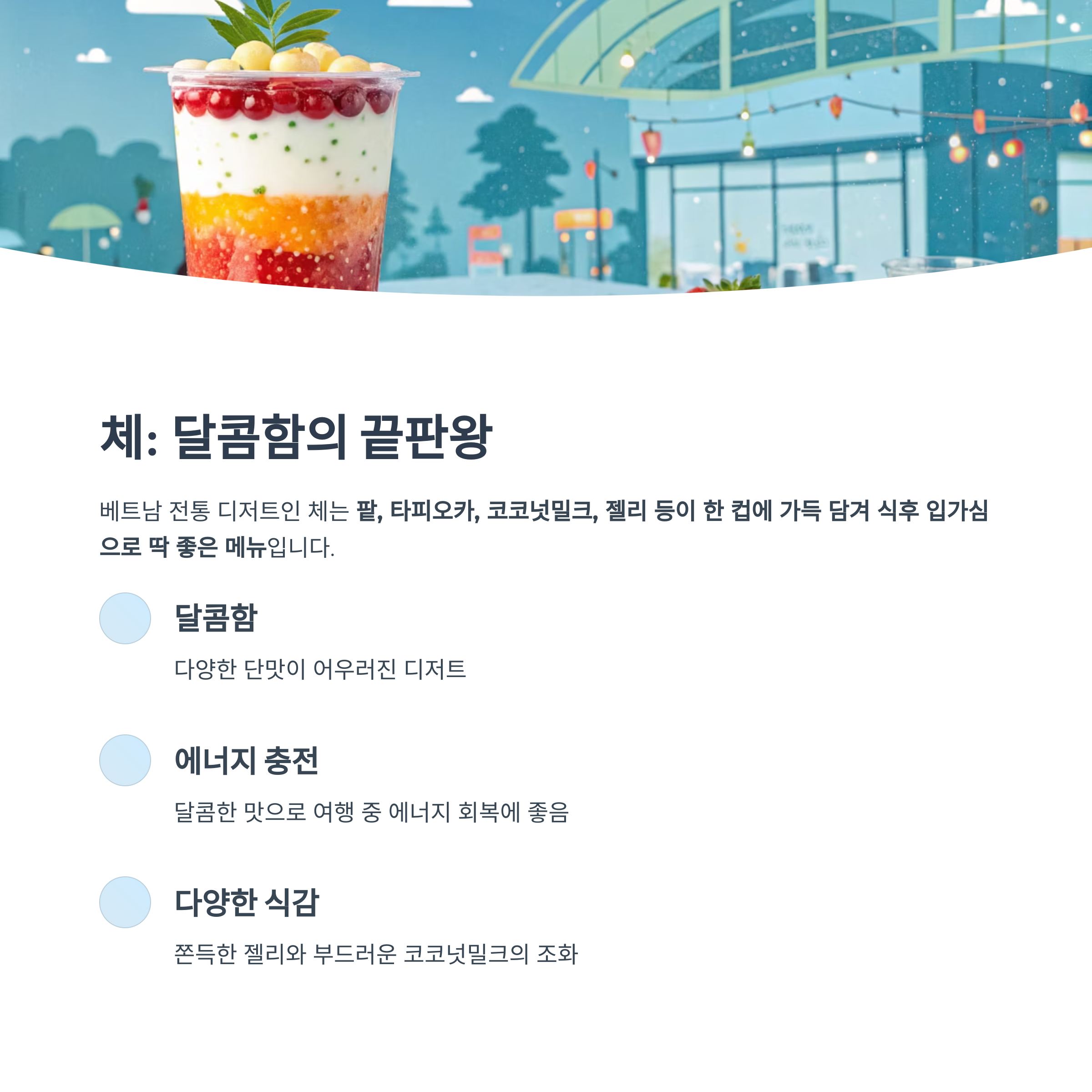 여행에서 디저트를 빼놓을 수 없다면 베트남 전통 디저트인 체를 추천드립니다.