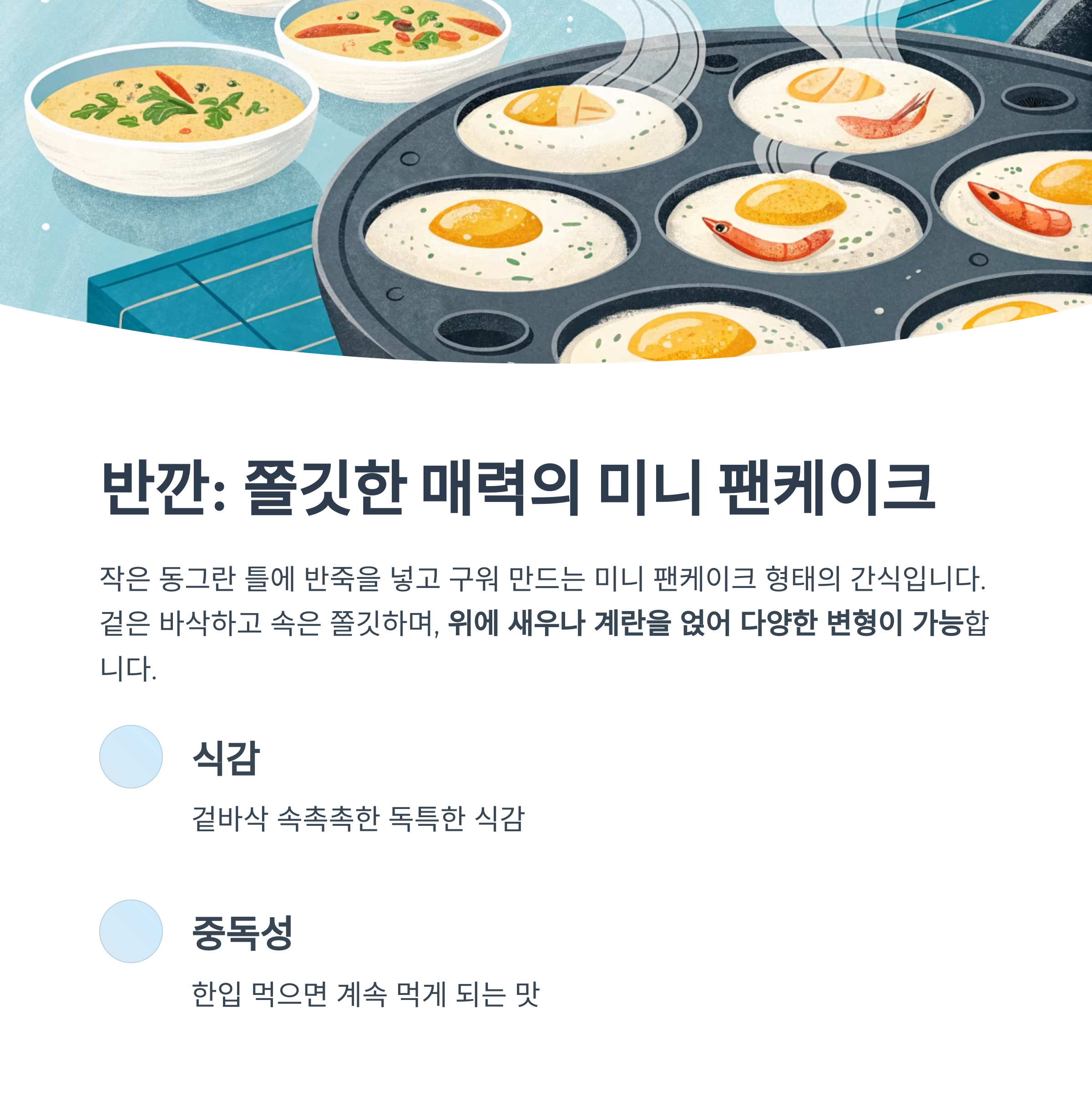 겉은 바삭하고 속은 쫄깃하며, 위에 새우나 계란을 얹어 다양한 변형이 가능합니다.