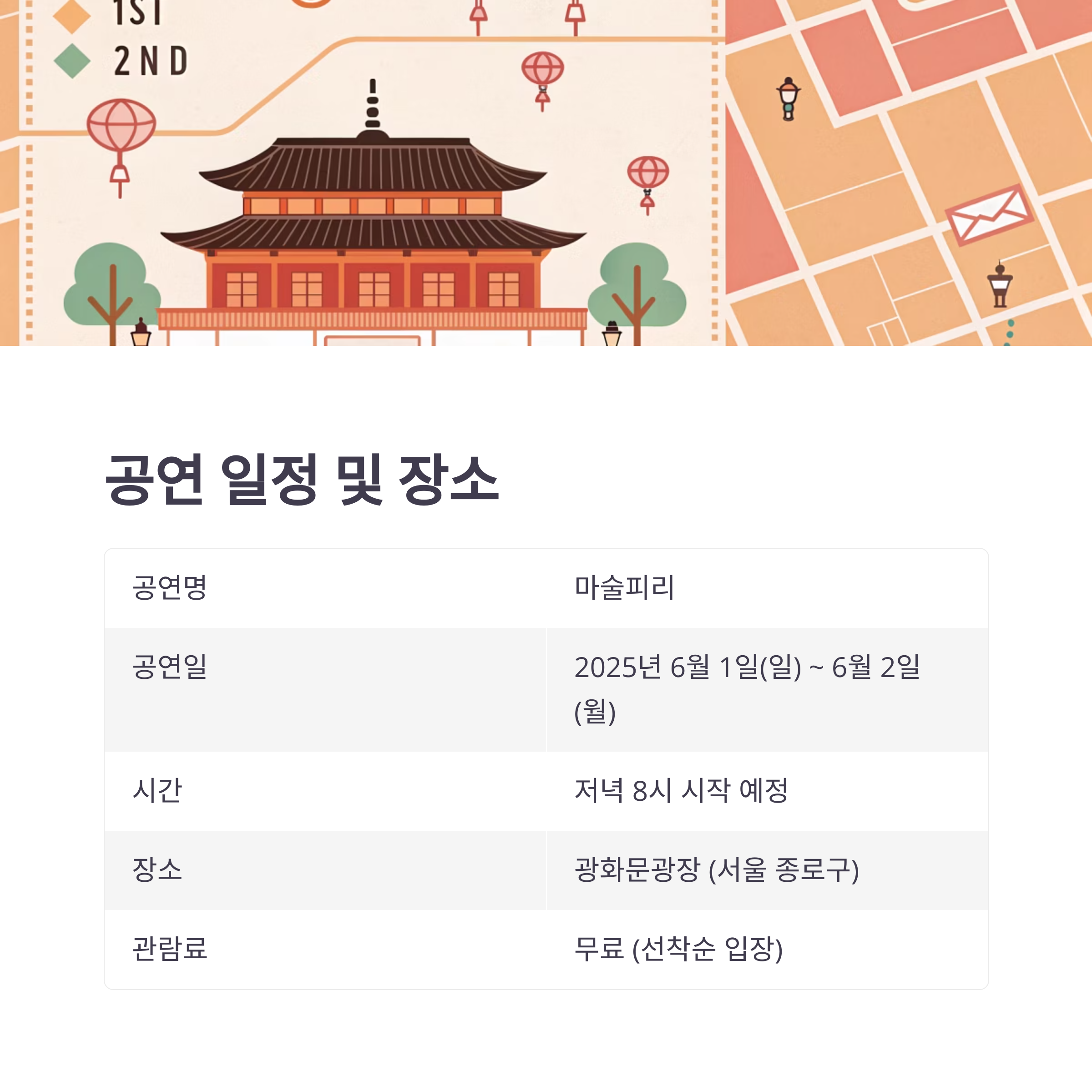 무대는 광화문광장 중앙에 설치되며, 좌석은 선착순으로 운영됩니다.