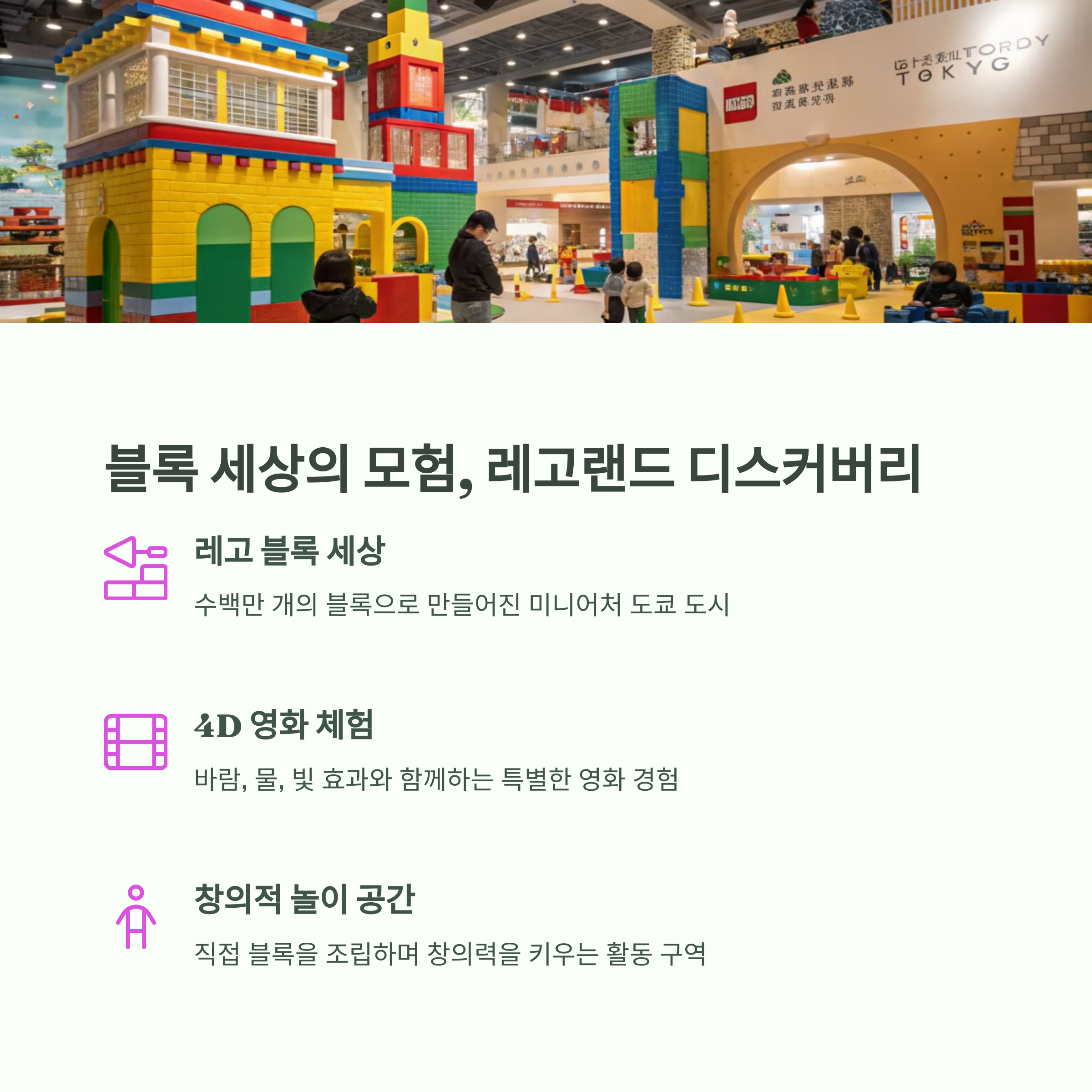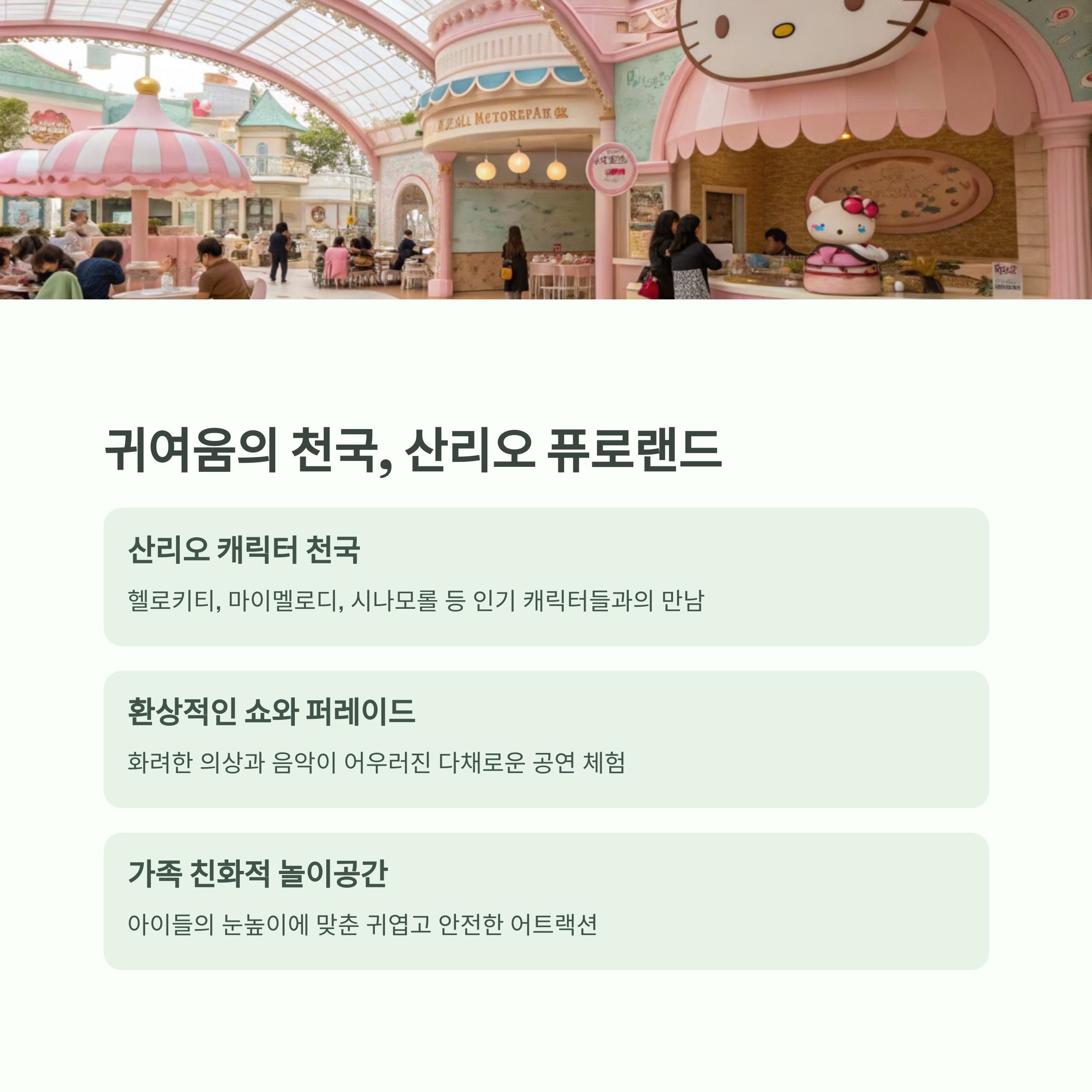| 다양한 테마 지역과 시즌별 이벤트 | 해양과 전설을 테마로 한 독특한 매력 | 산리오 캐릭터들과 귀여운 놀이기구들 |