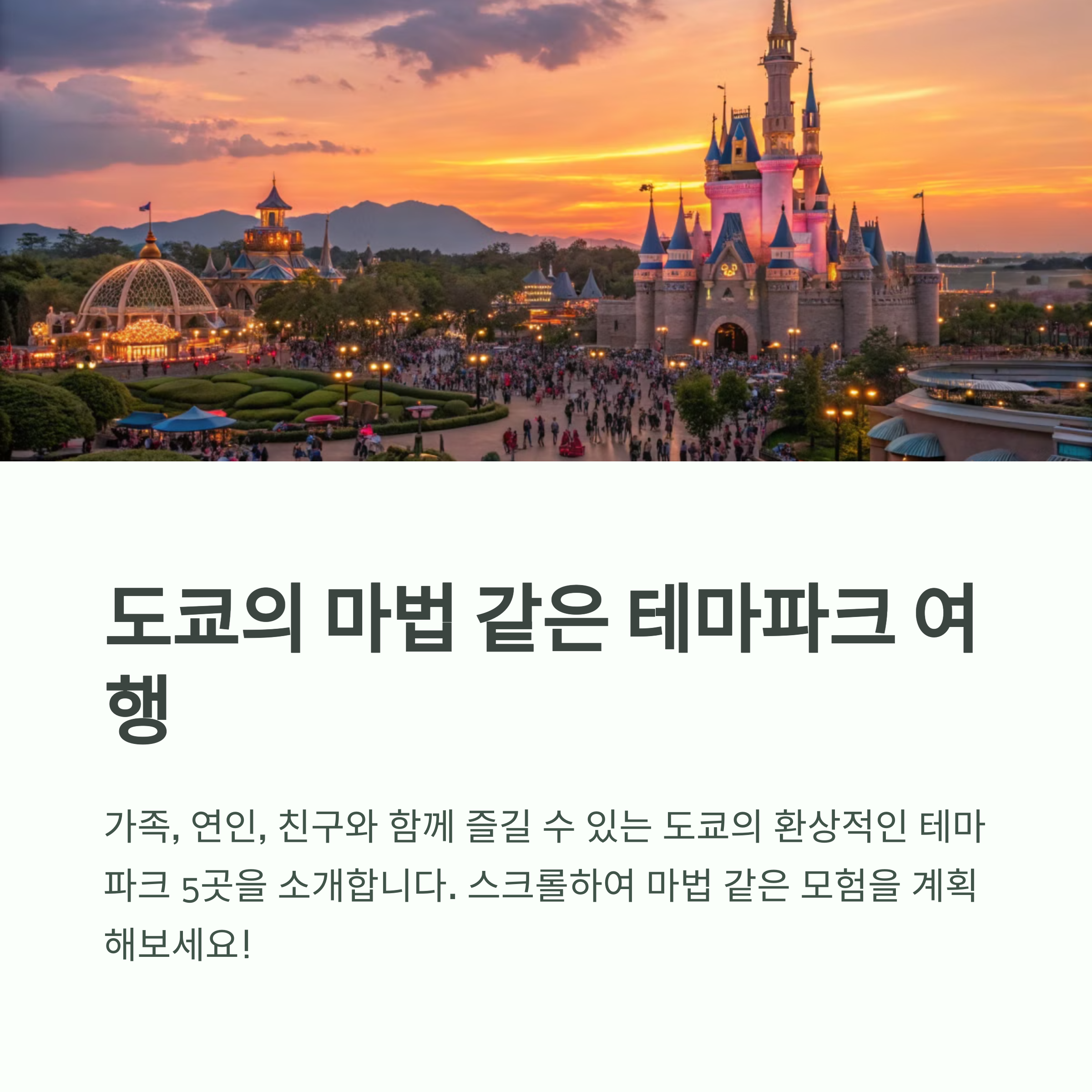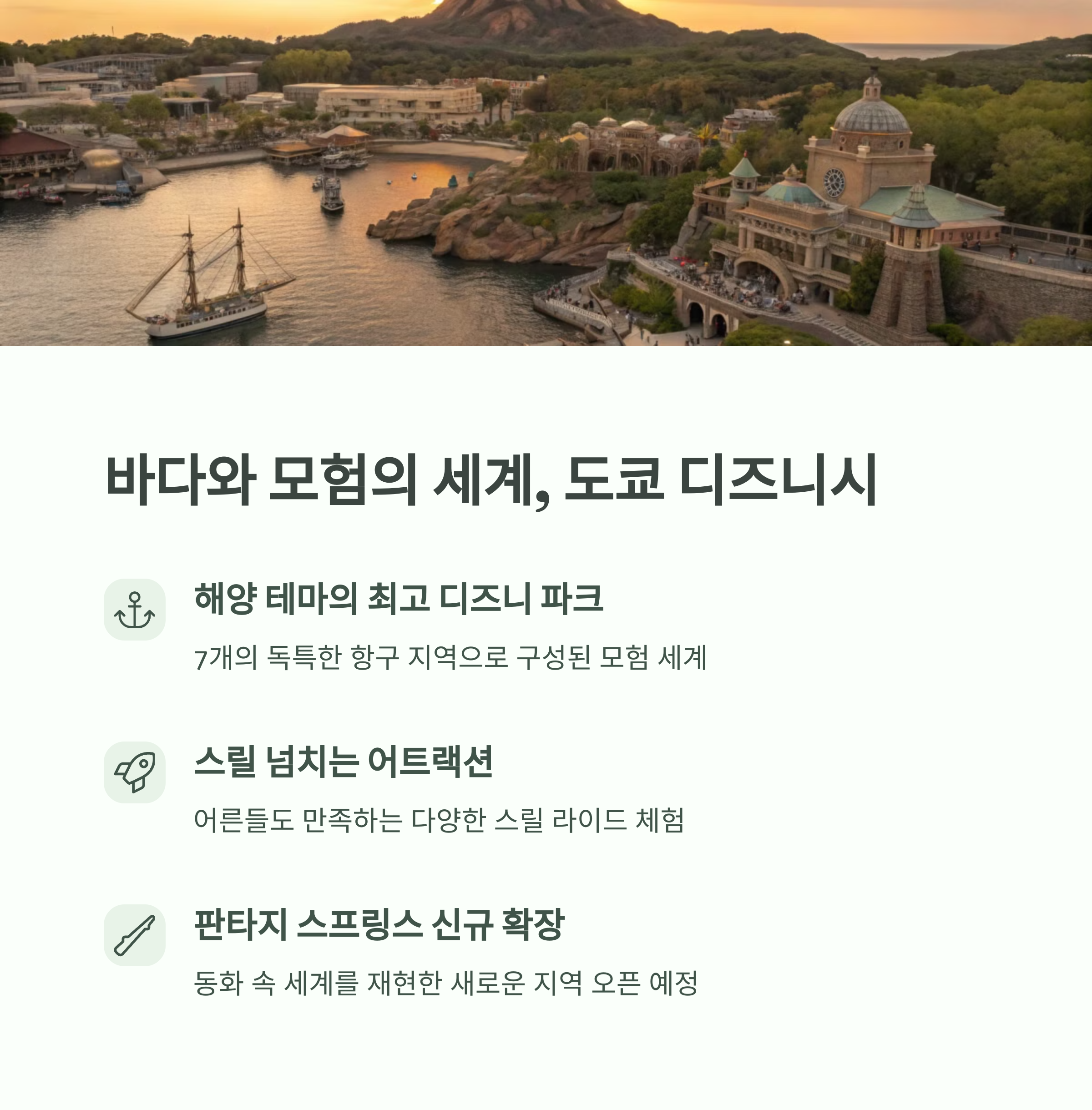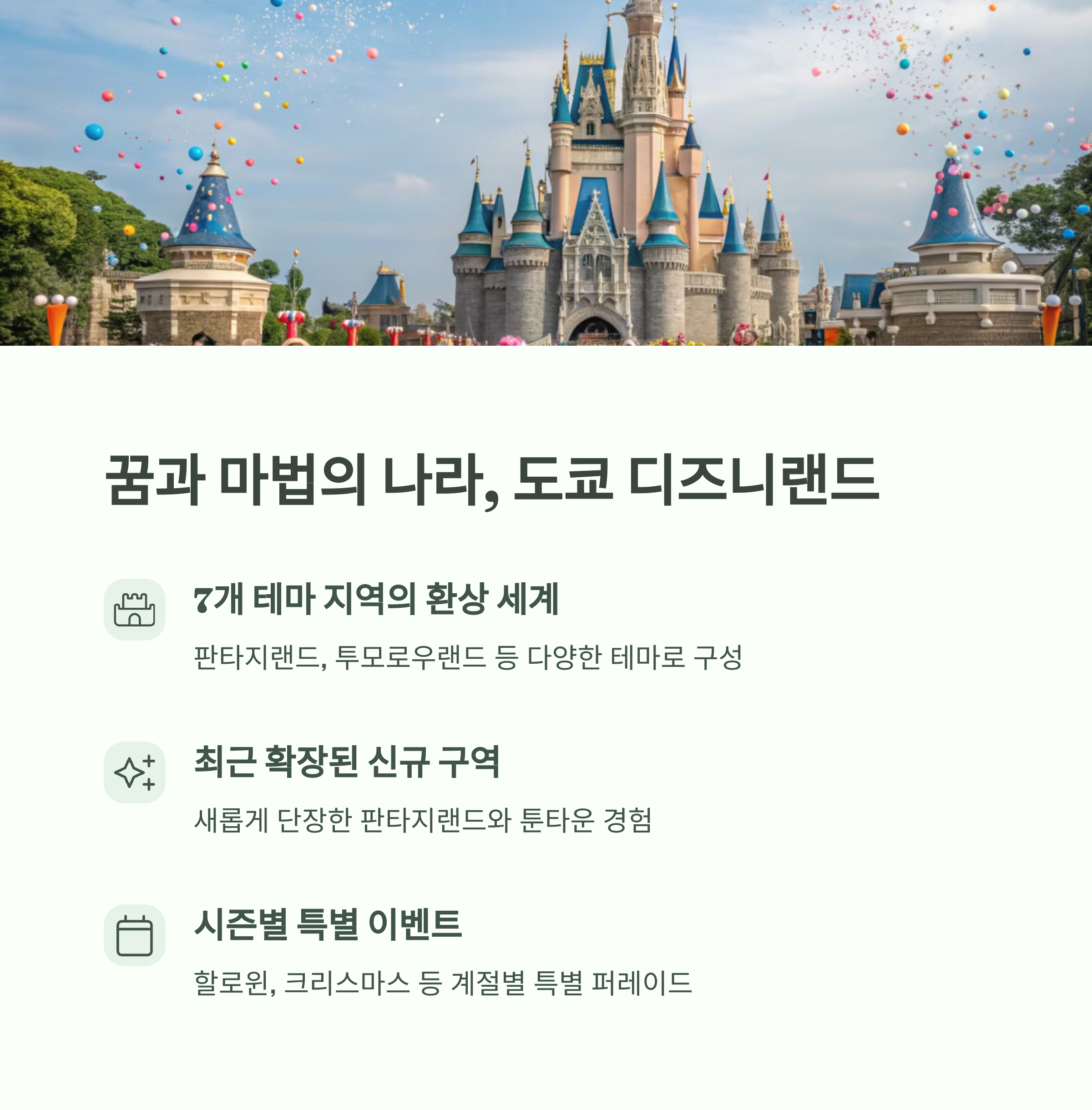 | 도쿄 디즈니랜드 | 다양한 테마 지역과 시즌별 이벤트로 유명하며, 최근 확장된 Fantasyland와 Toontown이 큰 매력을 줍니다. |