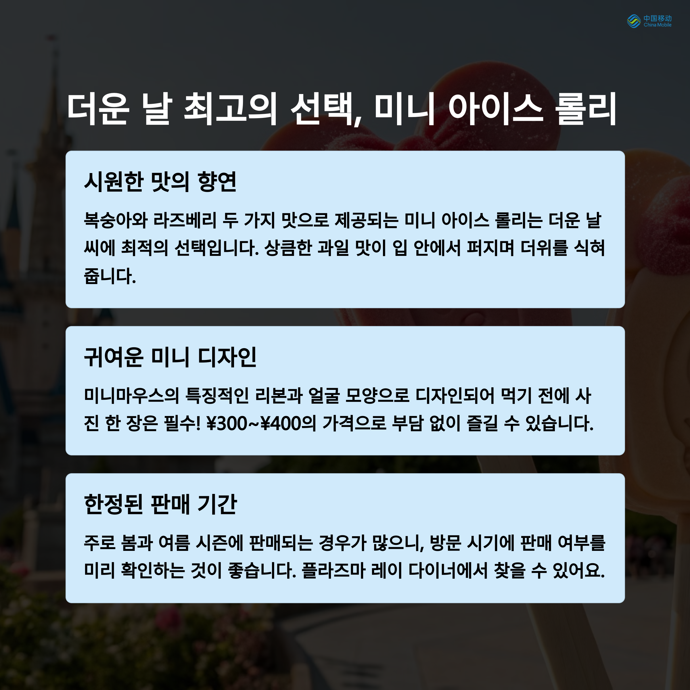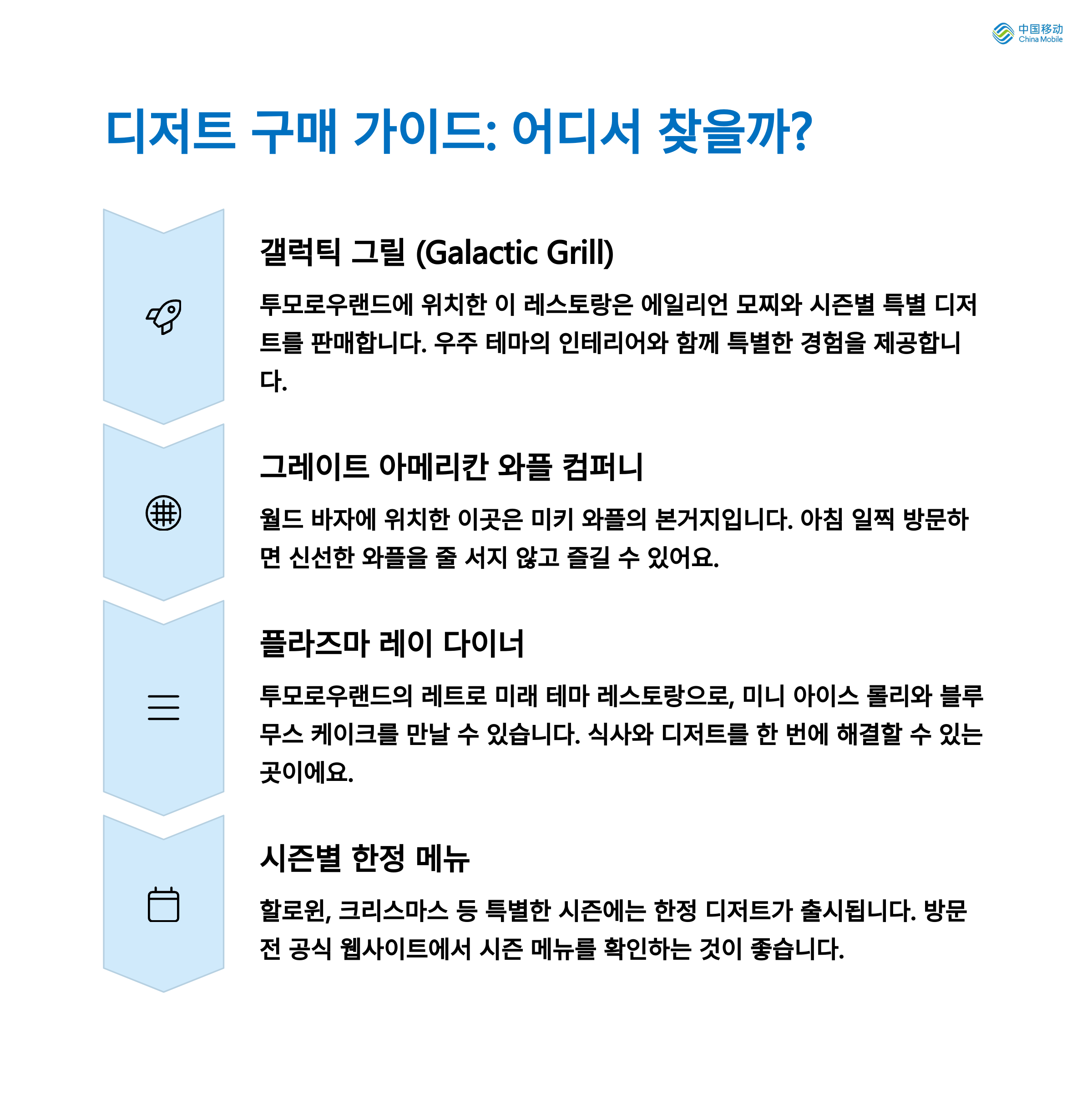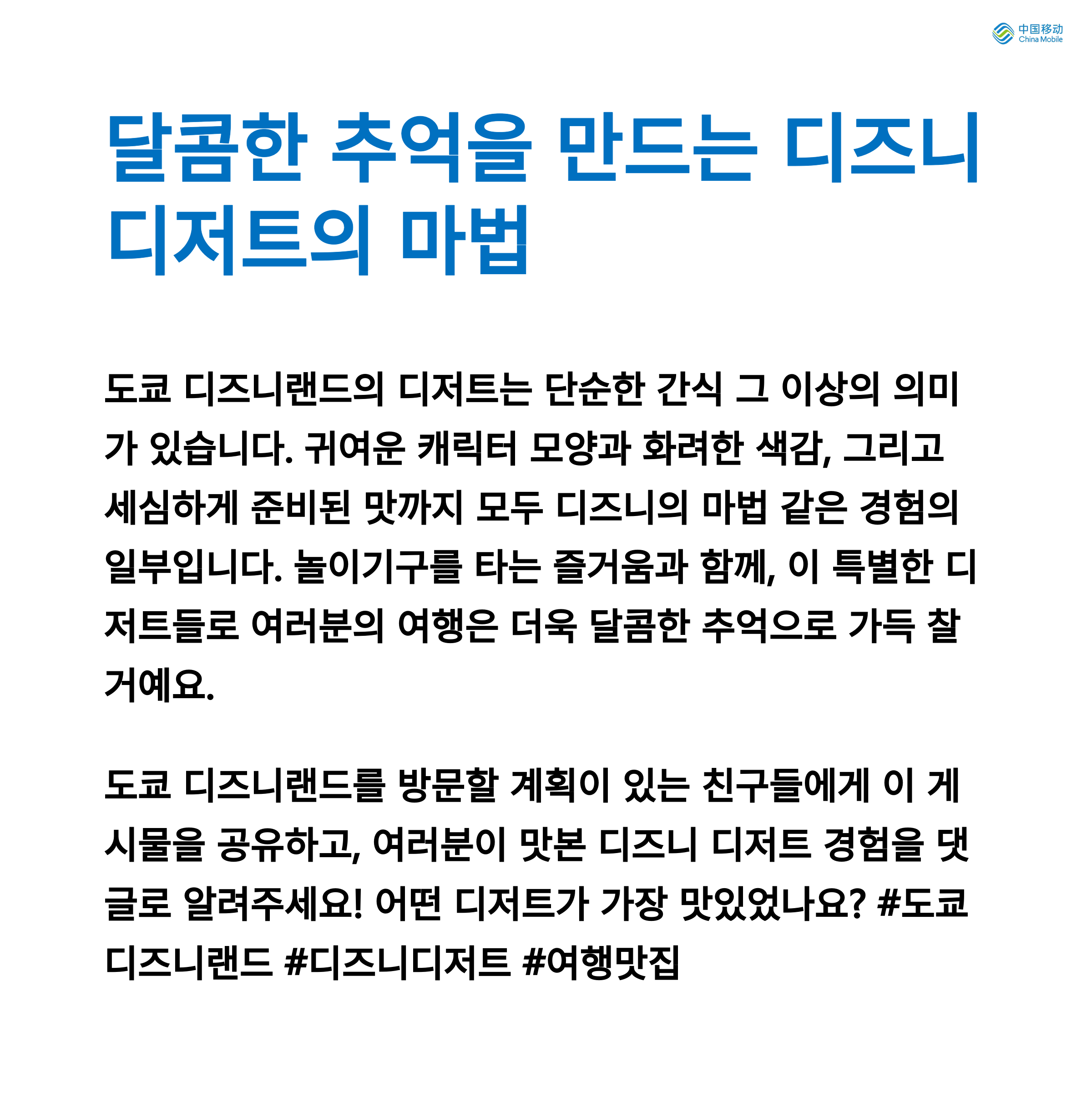 여러분이 도쿄 디즈니랜드에서 즐겨 먹은 디저트는 무엇인가요? 또는 새롭게 추천하고 싶은 디저트가 있다면 댓글로 함께 나눠주세요. 또 다른 방문객들에게도 큰 도움이 될 거예요!