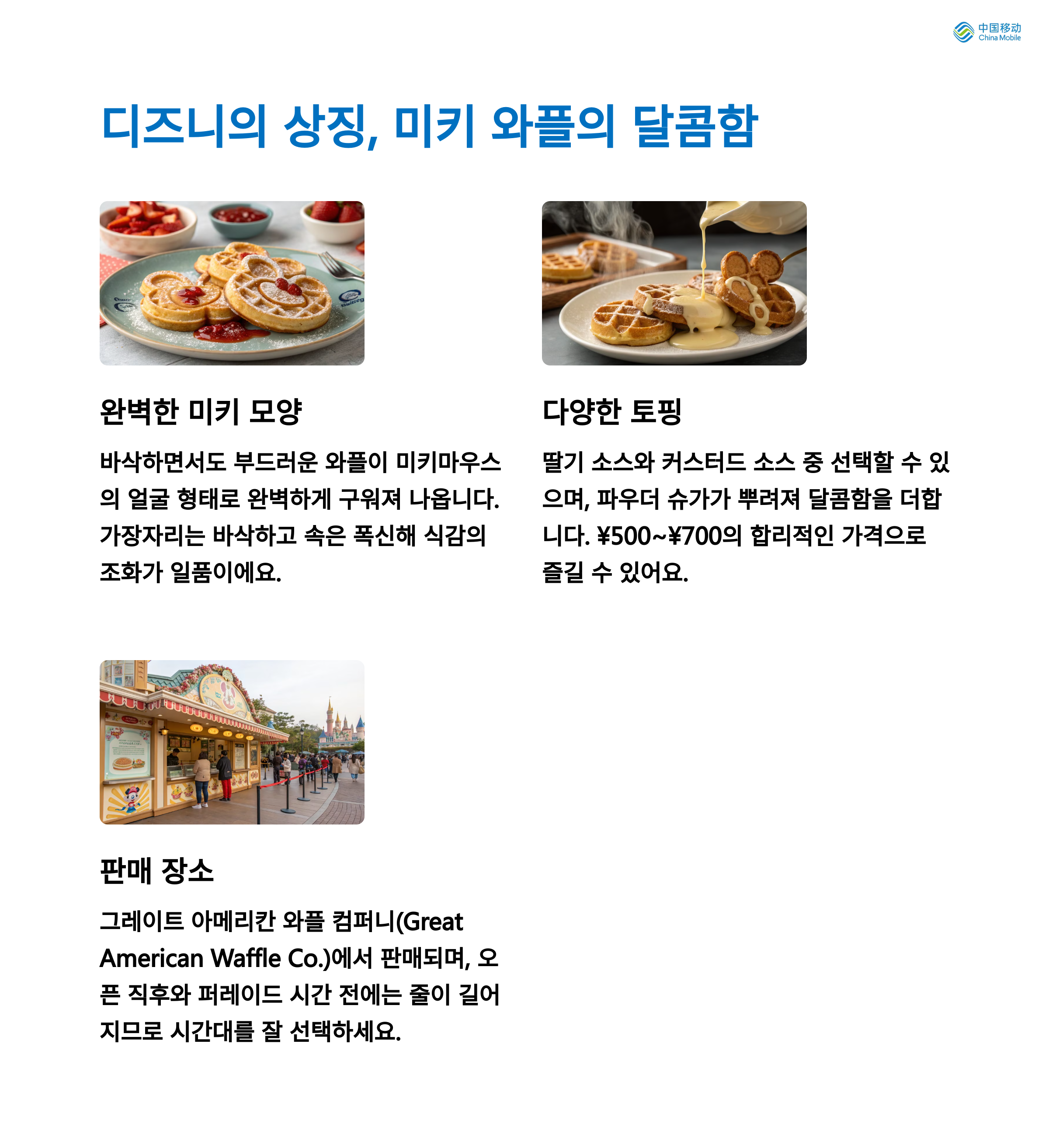 Alien Mochi는 귀여운 외계인 캐릭터로 디자인된 찹쌀떡으로, 초콜릿, 딸기, 커스터드 맛이 세트로 제공됩니다. 특히 Galactic Grill이나 Haunted Mansion 주변에서 손쉽게 구할 수 있어 접근성도 뛰어납니다. Mickey Waffles는 갓 구운 미키 모양 와플에 딸기 소스, 커스터드, 시즌 한정 아이스크림 토핑이 어우러져 눈과 입을 동시에 사로잡습니다. 카메라를 들게 만드는 비주얼과 부드러운 맛은 누구에게나 만족감을 줍니다.