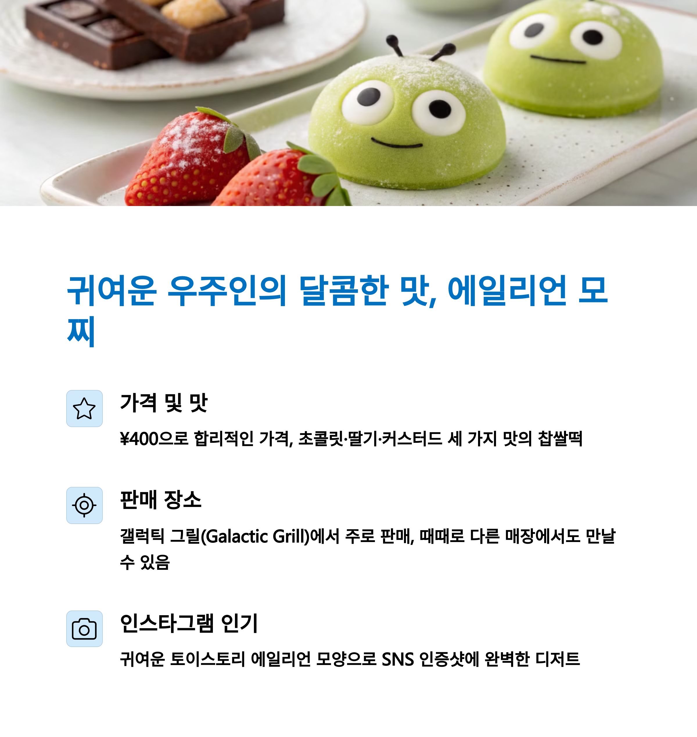 도쿄 디즈니랜드에서 디저트를 즐긴다는 건 단순한 간식을 먹는 것을 넘어, 마법 같은 경험을 추가하는 일입니다. 외계인 모양의 찹쌀떡부터 미키 와플, 바삭한 크림 페이스트리까지, 다양한 디저트는 디즈니 특유의 테마성과 감성을 담고 있습니다. 특히 아이들과 함께 여행 중인 가족 단위 방문객들은 외형적으로 귀엽고 맛까지 좋은 디저트를 통해 더욱 즐거운 추억을 만들 수 있습니다. 계절마다 한정 출시되는 메뉴도 많아, 매 방문마다 새로운 경험이 가능한 점 역시 큰 매력입니다.