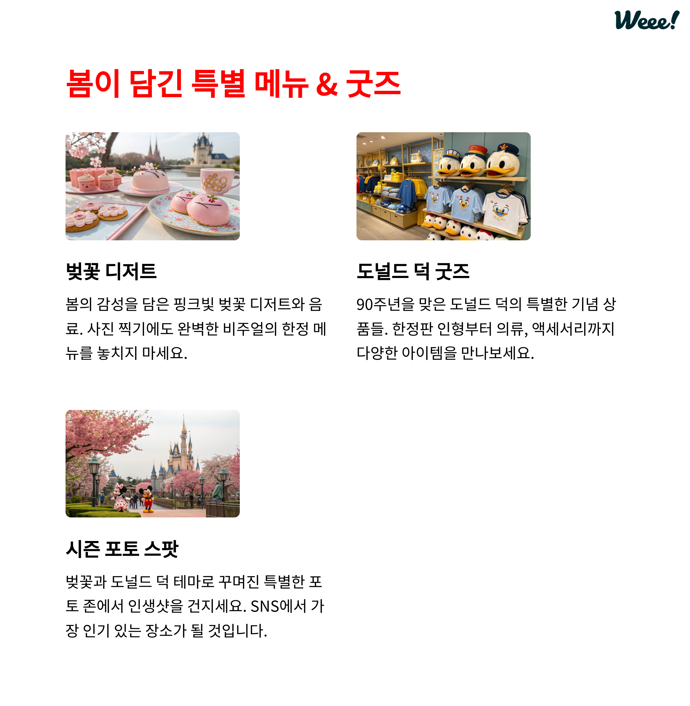 도쿄 디즈니랜드의 봄 시즌은 매년 수많은 디즈니 팬들이 기다리는 특별한 시기입니다. 2025년에는 도널드 덕의 "꿈의 도시" 콘셉트를 바탕으로 한 ‘Donald's Quacky Duck! Duck! Duck City’ 이벤트가 주목받고 있습니다. 공원 전체가 도널드 덕의 세계관으로 재해석되어 장식되며, 방문객들은 색다른 분위기 속에서 디즈니의 마법을 만끽할 수 있습니다. 퍼레이드와 캐릭터 포토존은 물론, 테마 푸드와 기념품도 다양하게 제공되어 봄철 나들이의 완성도를 높여줍니다.