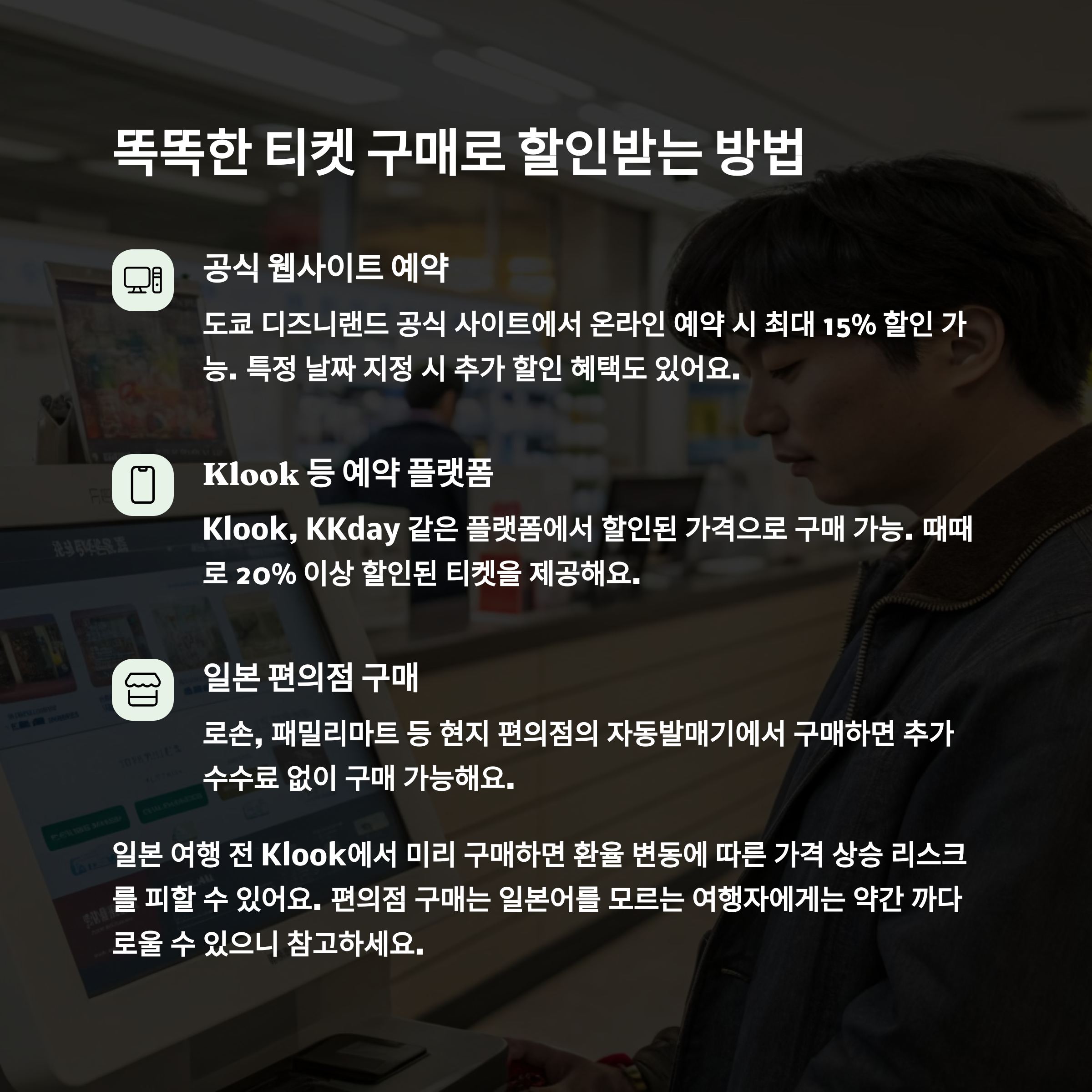 할인 티켓을 구매하는 가장 효율적인 방법은 온라인 플랫폼을 활용하는 것입니다. 특히 Klook이나 KKday와 같은 인증된 여행 사이트는 한국어 지원이 가능하며, 예약과 동시에 QR 코드가 발급되어 디즈니 앱과 연동이 가능합니다. 일본 내 편의점(Lawson, Family Mart 등)에서도 구매할 수 있지만, 해외 사용자에게는 온라인 구매가 더 간편하고 안전한 선택입니다. 또한 시즌별로 제공되는 특별 할인 상품도 놓치지 마세요. "Gift Passport"와 같은 한정 프로모션은 매우 합리적인 가격에 제공됩니다.