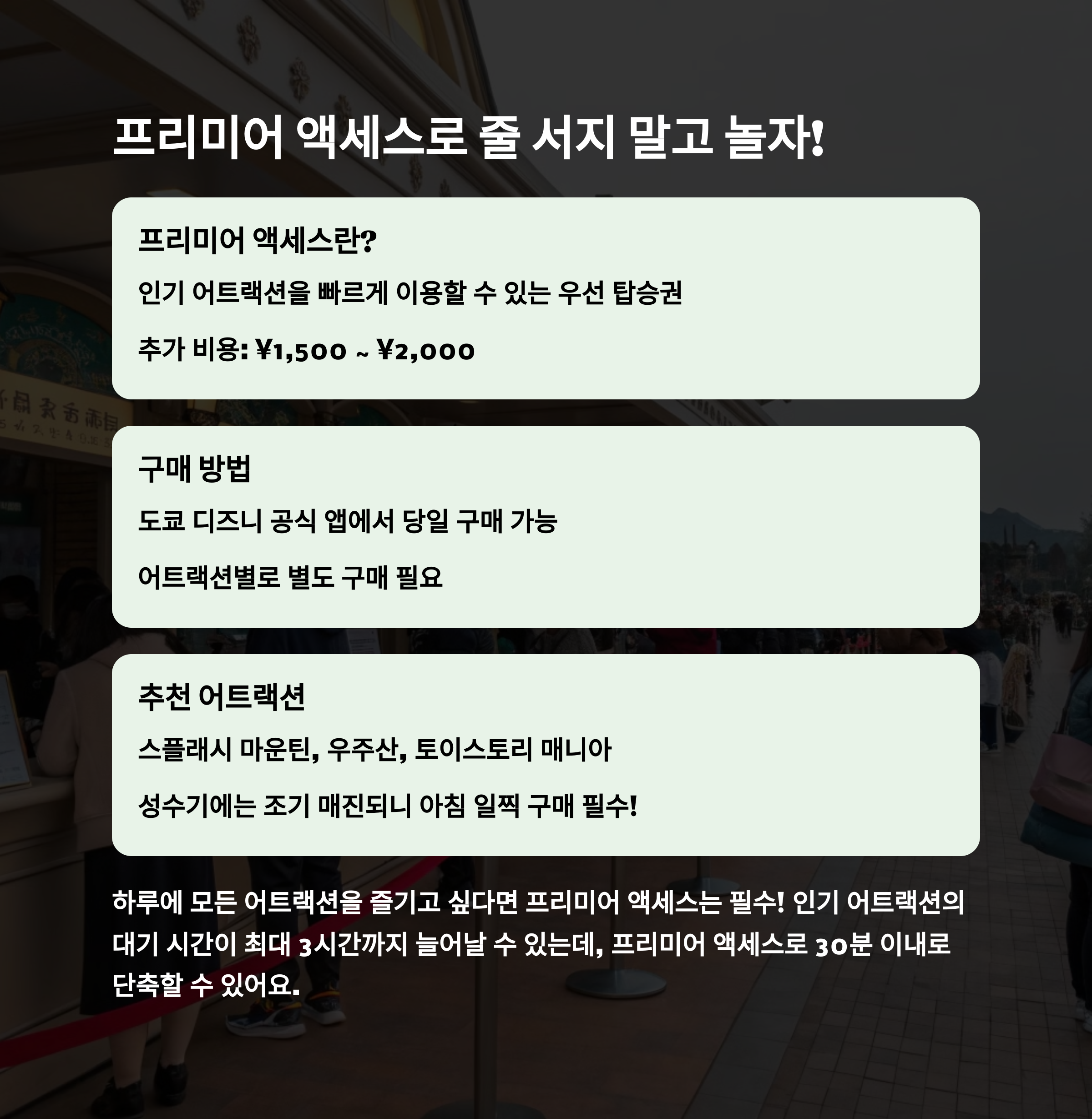 필수는 아니지만 인기 어트랙션을 오래 기다리지 않고 빠르게 이용하고 싶다면 유료 프리미어 액세스를 권장합니다.