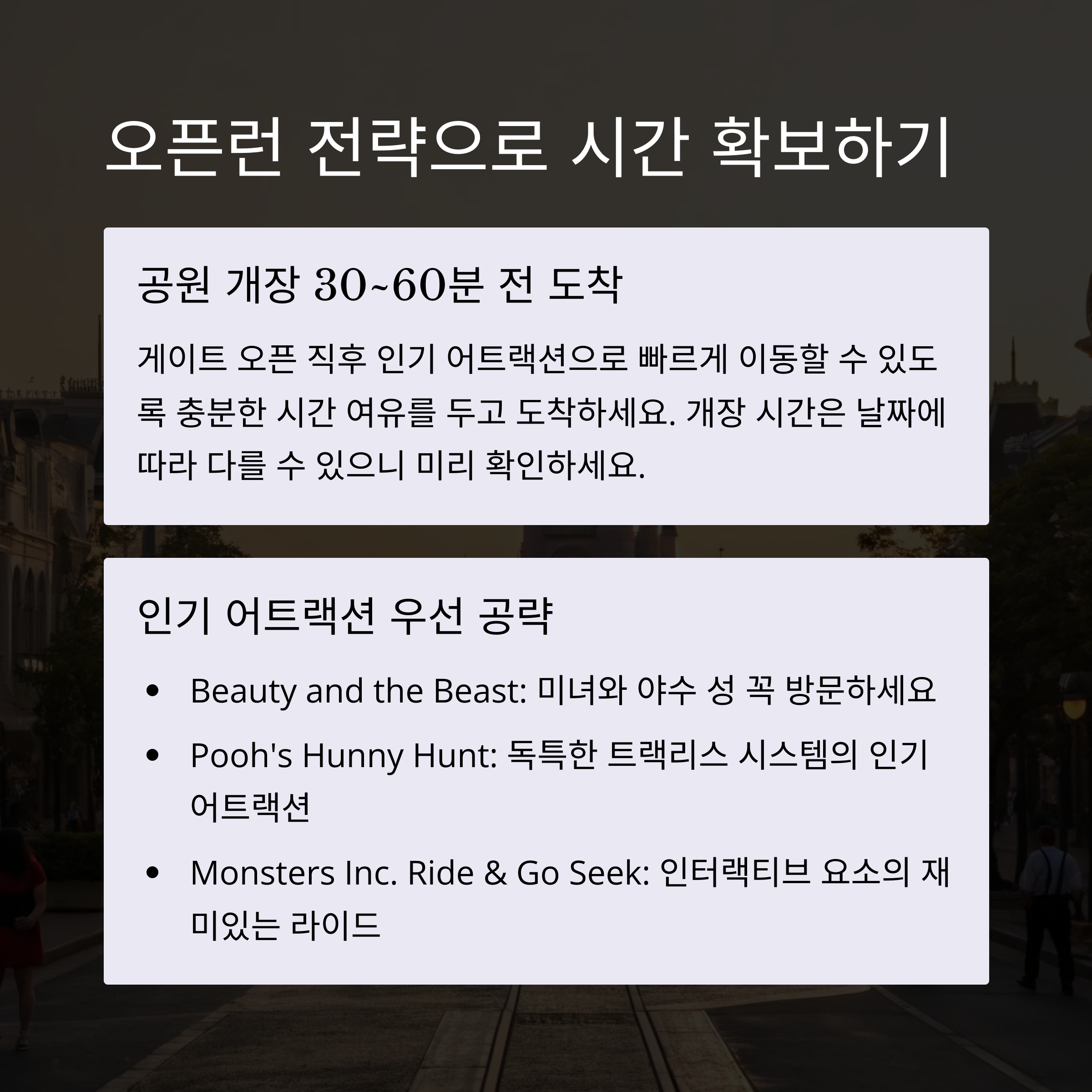 디즈니랜드의 인기 어트랙션은 대기 시간이 1시간 이상 걸리는 경우가 많습니다. 이때 프라이오리티 패스 또는 프리미어 액세스를 활용하면 줄 서지 않고 어트랙션을 이용할 수 있습니다. 이는 디즈니 앱을 통해 유료 또는 무료로 제공되며, 각 어트랙션별로 예약 가능한 시간이 다르므로 하루 일정을 미리 계획하는 것이 중요합니다. 또한 입장 후 바로 인기 시설부터 방문하는 것도 시간을 절약하는 팁입니다.