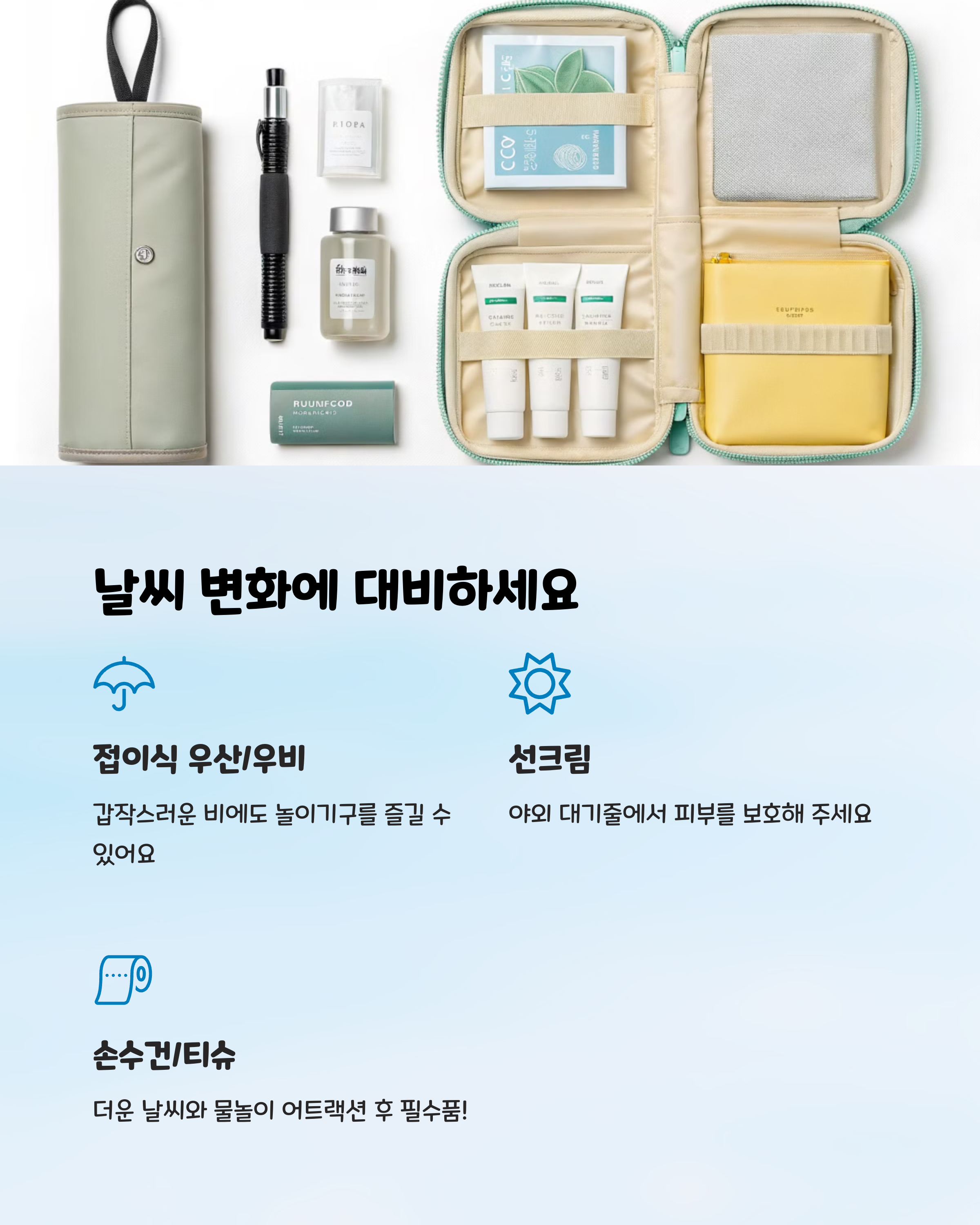 날씨 및 위생 관련 아이템 우산, 레저 시트, 손수건, 바디 와이프 등 기상 대비 필수품