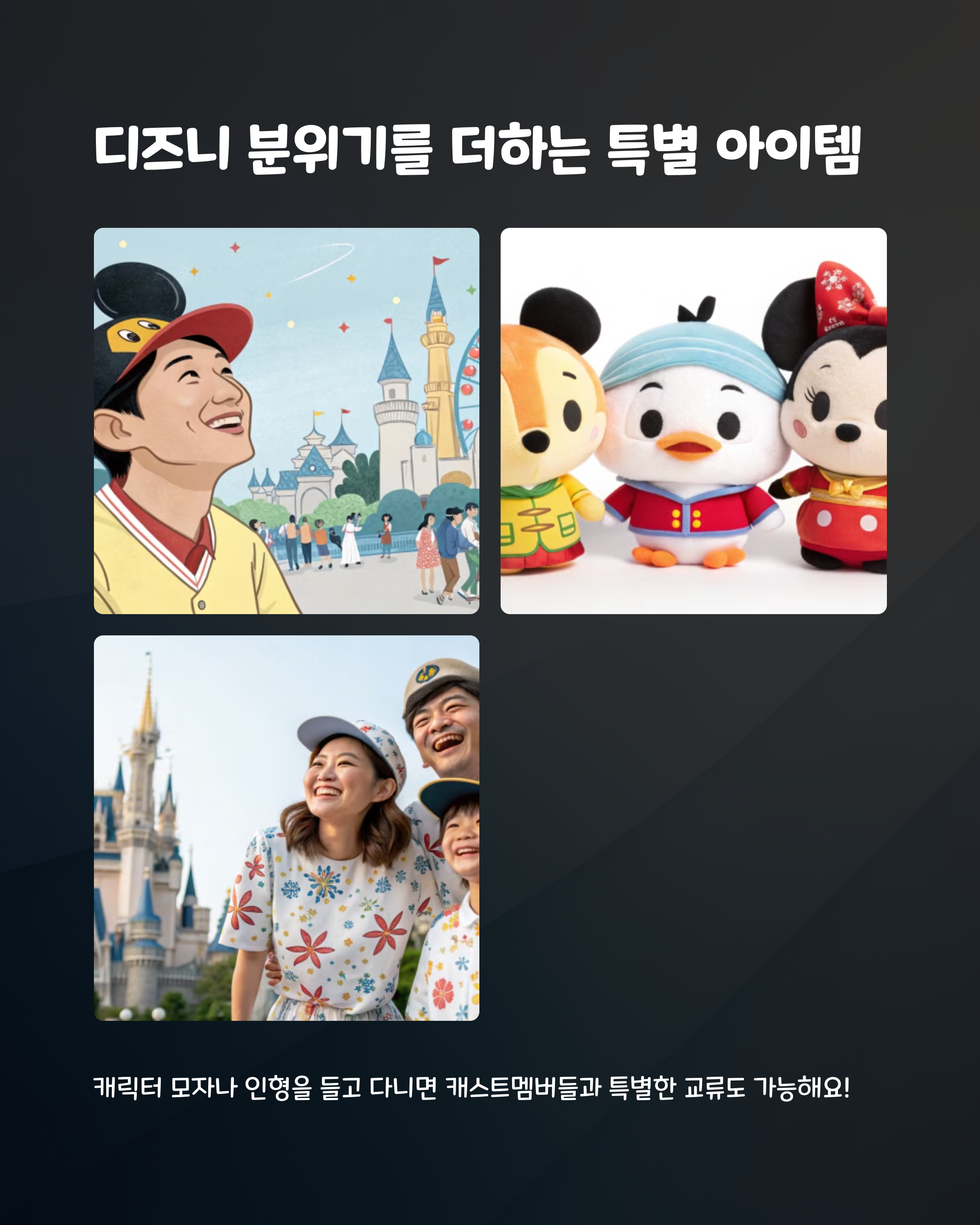 하루 종일 걷기에 편한 운동화나 워킹 슈즈 비가 올 때 준비할 우산 또는 우비 디즈니 캐릭터 모자나 인형
