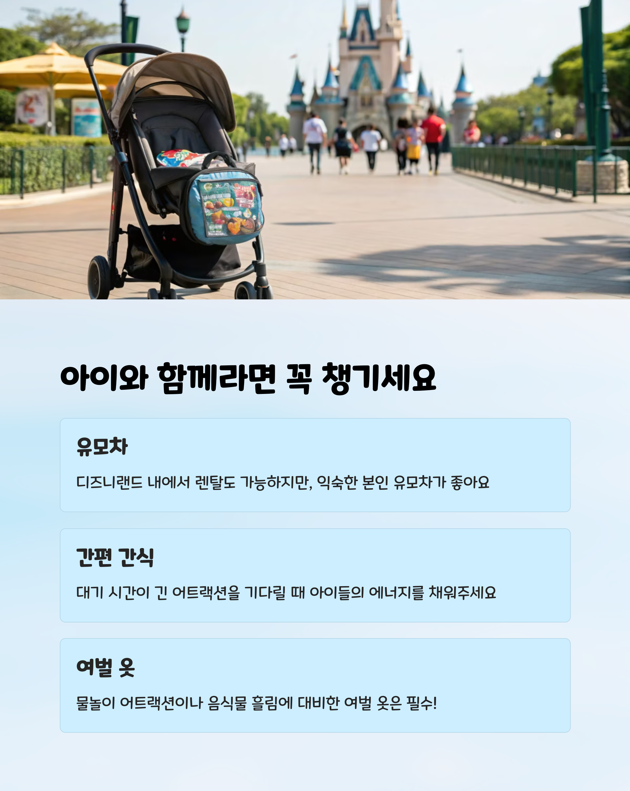 디즈니랜드에서 즐기기 위한 필수 준비물은 유아와 어린이 여행객을 위한 물품도 포함됩니다. 접이식 유모차는 이동과 보관이 용이하여 매우 유용합니다. 또한, 아기 캐리어나 비상용 간식도 준비하세요. 특히, 그래놀라 바나 과일 퓨레는 어린이가 즐길 수 있는 간편한 간식입니다. 그리고 디즈니 테마 아이템을 준비하는 것도 중요한 포인트입니다. 캐릭터 모자나 인형 등은 여행의 즐거움을 더해줍니다. 디즈니랜드에서 특별한 추억을 만들기 위해 준비물 하나하나에 신경 써서 여행을 더욱 풍성하게 만들어보세요.