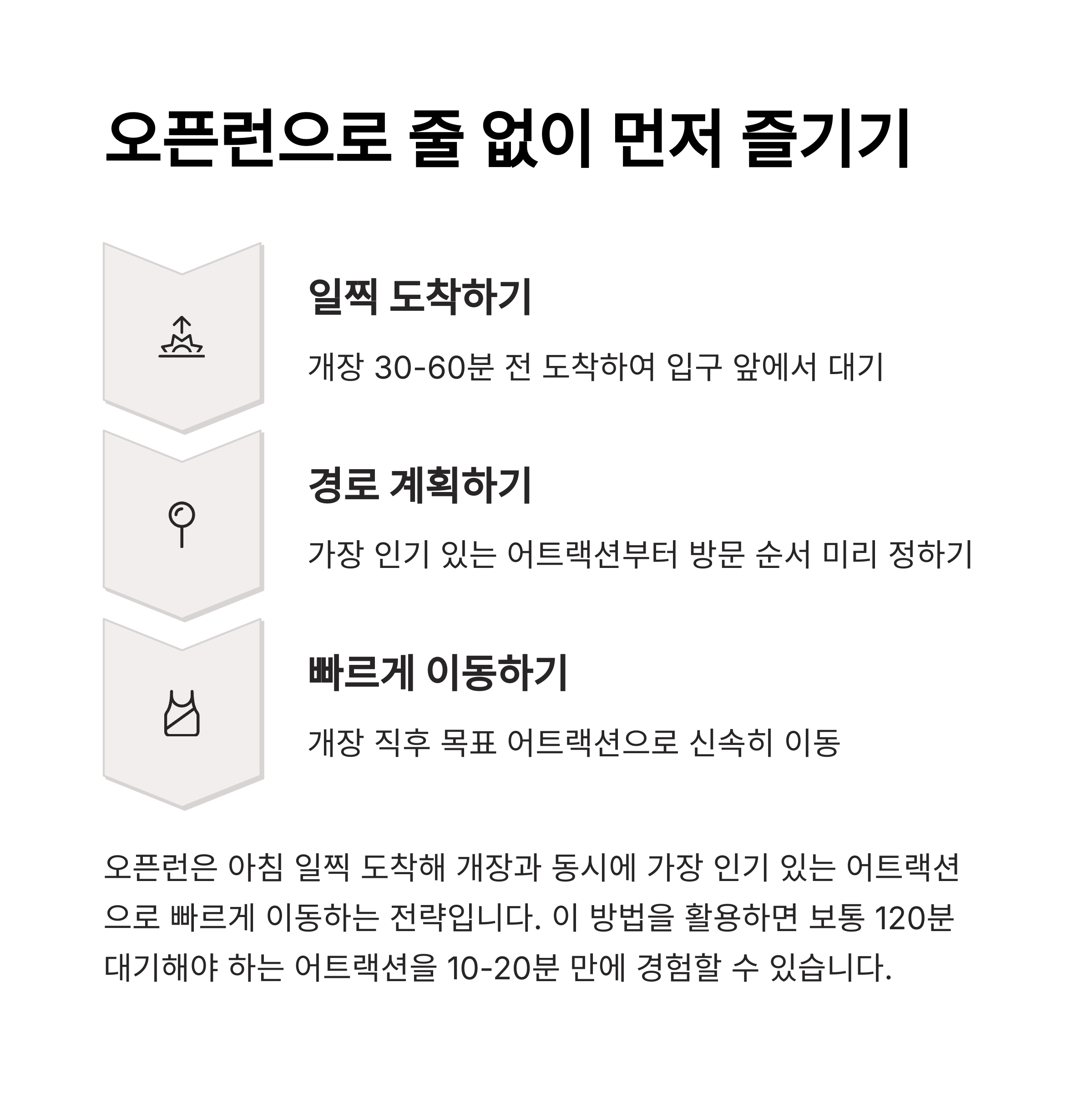 유료 빠른 입장 시스템으로 시간 절약 가능 | 무료 패스로 인기 어트랙션 예약 가능 | 혼자 탑승 시 대기 시간 단축 |