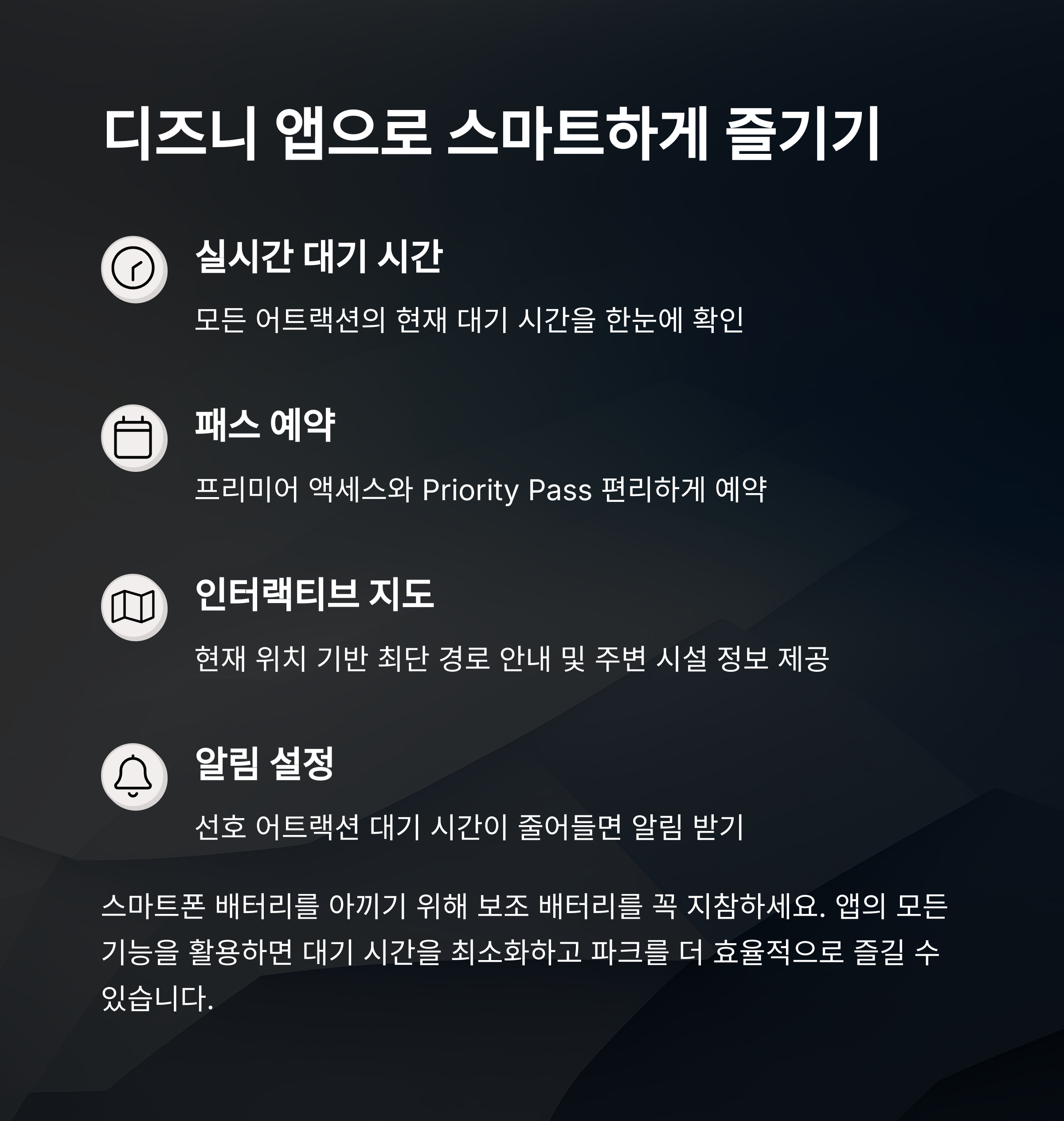 프리미어 액세스는 유료이지만 매우 효과적인 방법입니다. 원하는 어트랙션을 앱에서 미리 예약하고 정해진 시간에 줄 없이 바로 입장할 수 있습니다. 가격은 어트랙션에 따라 상이하지만, 대기 시간을 생각하면 충분히 투자할 만한 옵션입니다. 또한 Priority Pass는 무료로 제공되는 패스로, 지정된 인기 어트랙션에 한해 지정 시간에 입장할 수 있습니다. 이 두 가지를 적절히 활용하면, 하루에 여러 개의 어트랙션을 스트레스 없이 즐길 수 있게 됩니다.