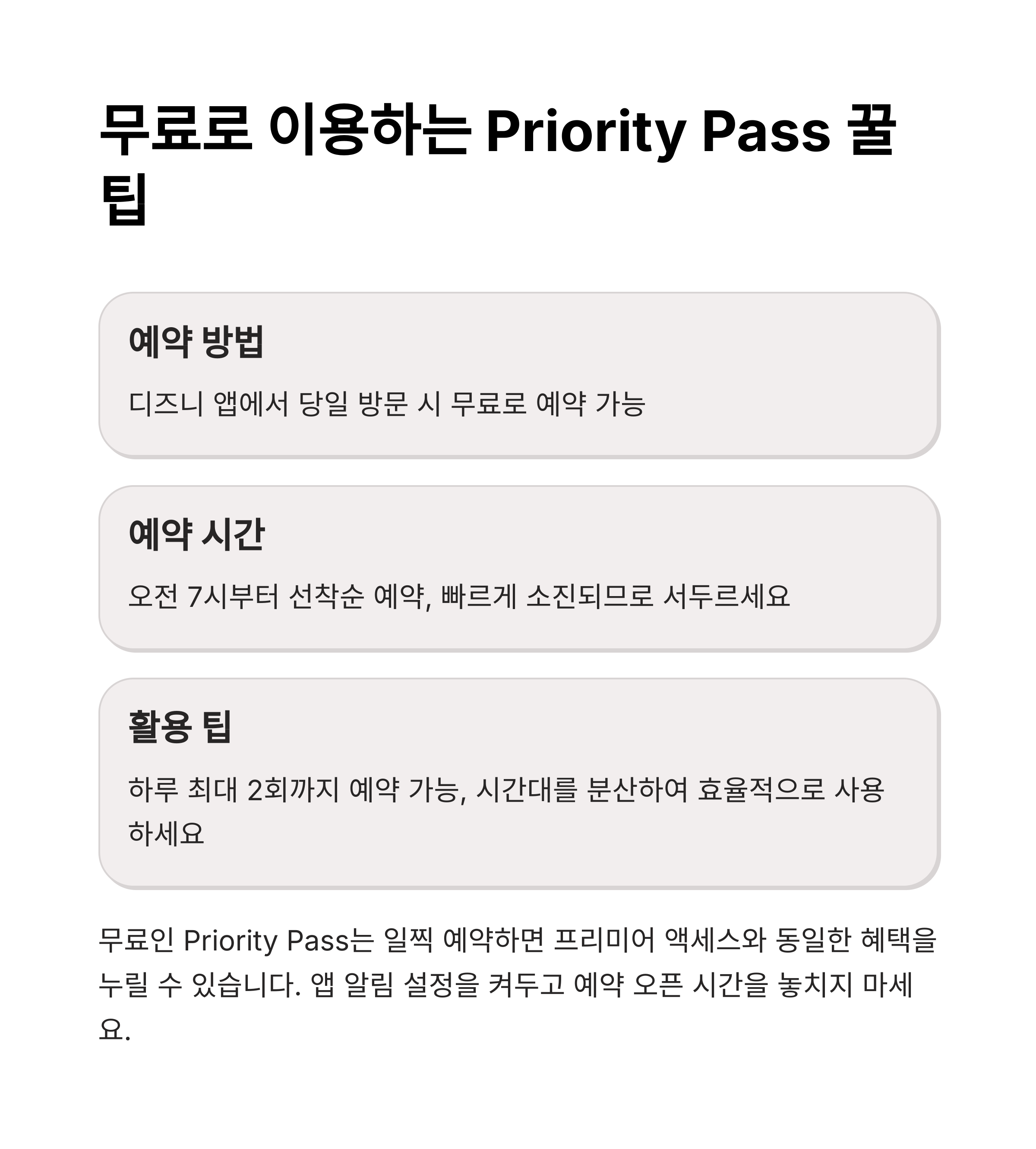 대기 시간 단축 팁 | Priority Pass, Premier Access 활용 |