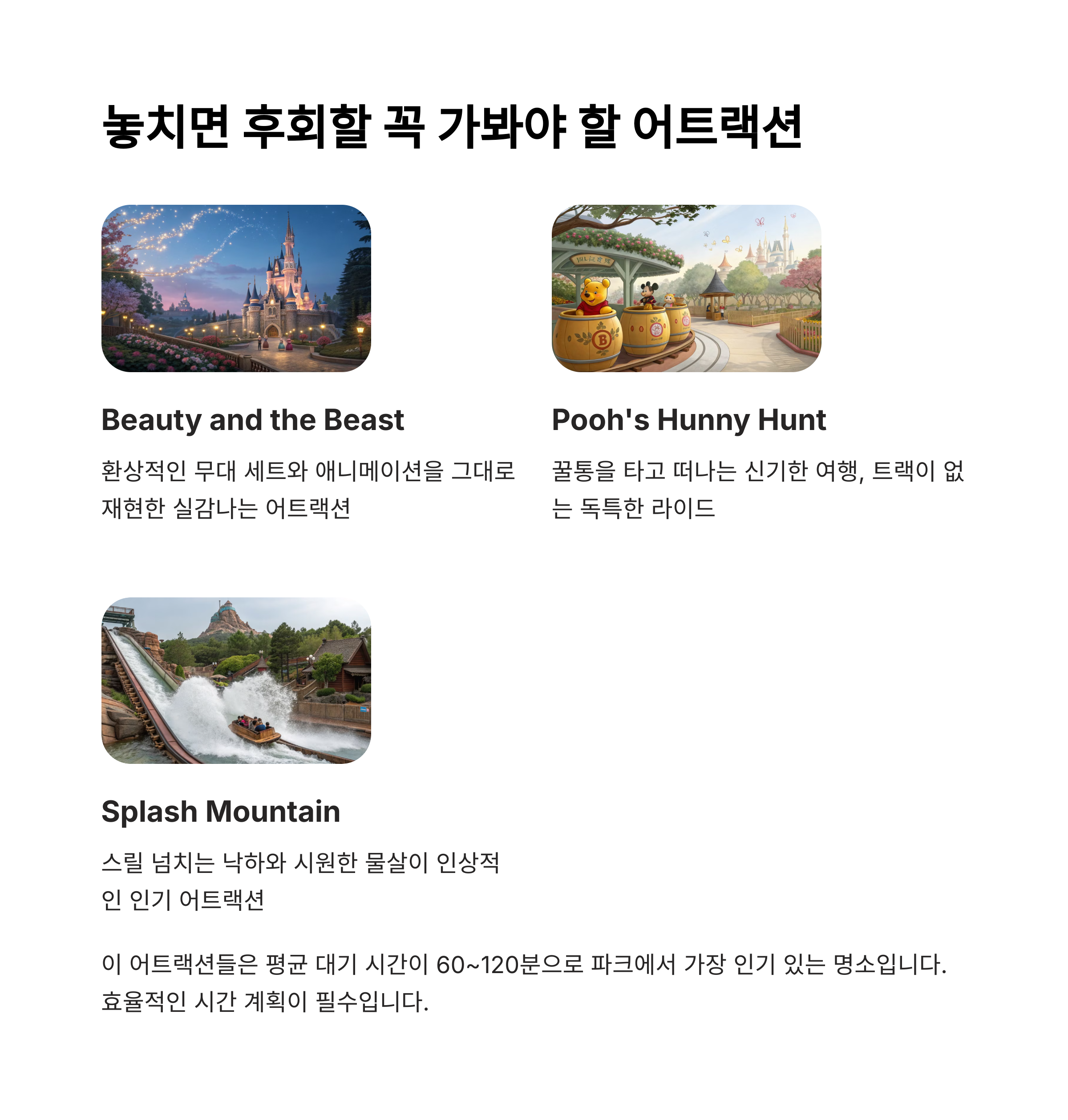 인기 어트랙션 | Beauty and the Beast, Hunny Hunt 등 |