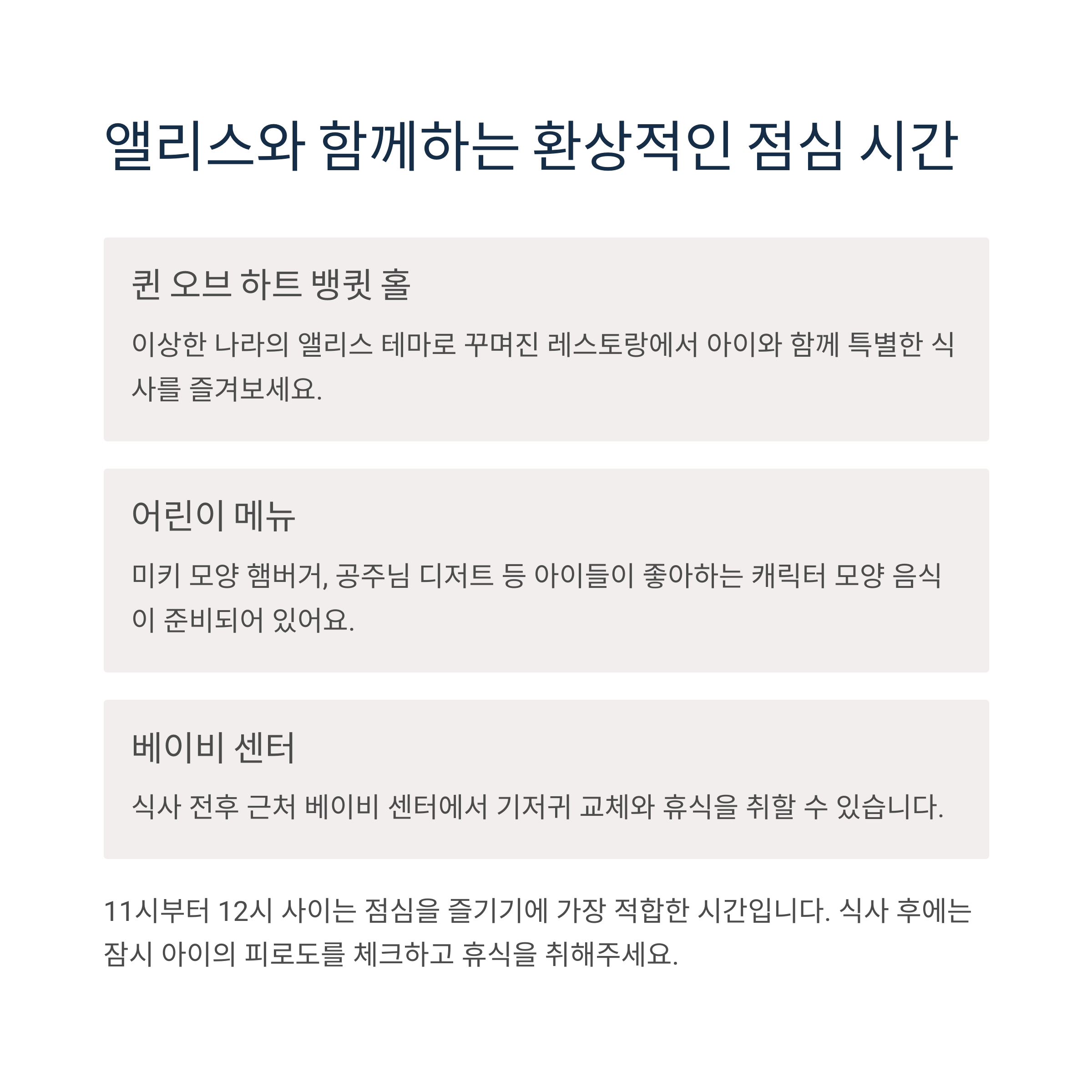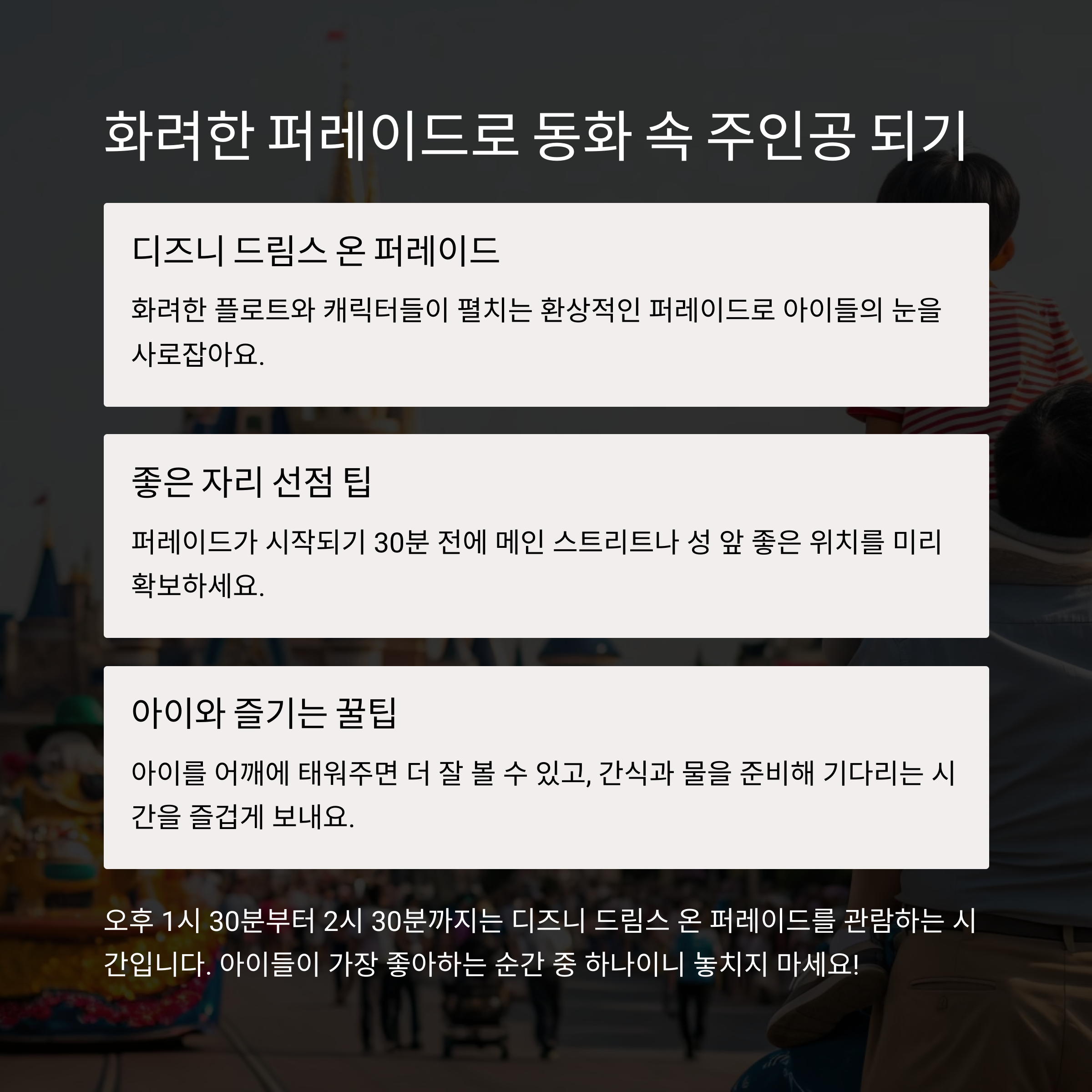 | 대기 시간 짧고 안전한 콘텐츠 위주로 구성 | 아이 식사 메뉴 다양하며 대기 시간 적음 | 퍼레이드 시간 전 30분 이상 여유 있게 자리 확보 |