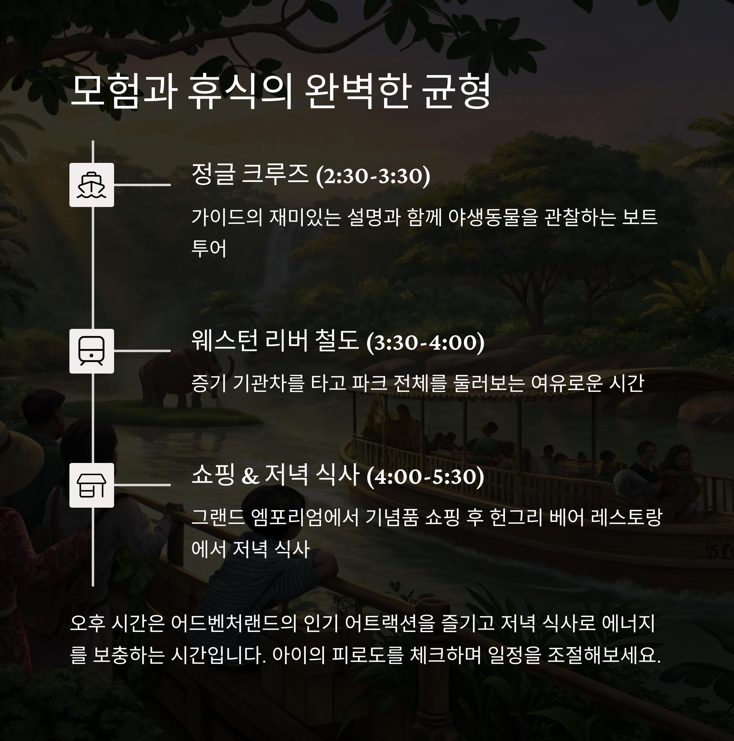 | 휴식과 식사시간 배치 | 퍼레이드와 식사시간을 적절히 배치해 체력 보충 유도 |