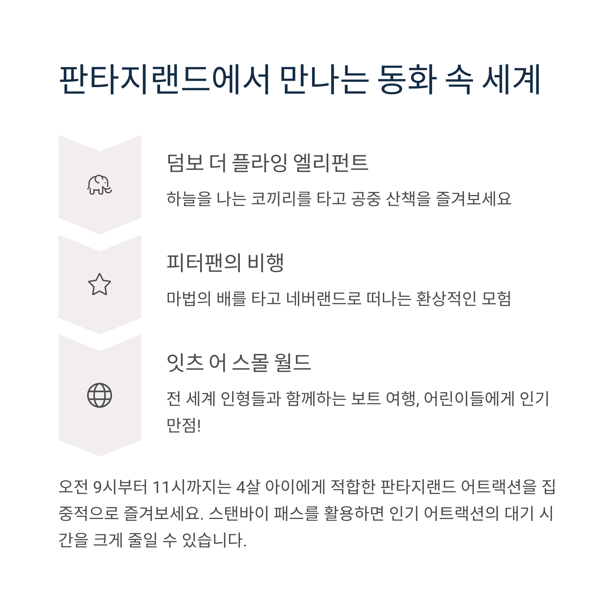 | 어린이 전용 어트랙션 | 기다림이 짧고 자극이 적은 어트랙션을 중심으로 구성 |