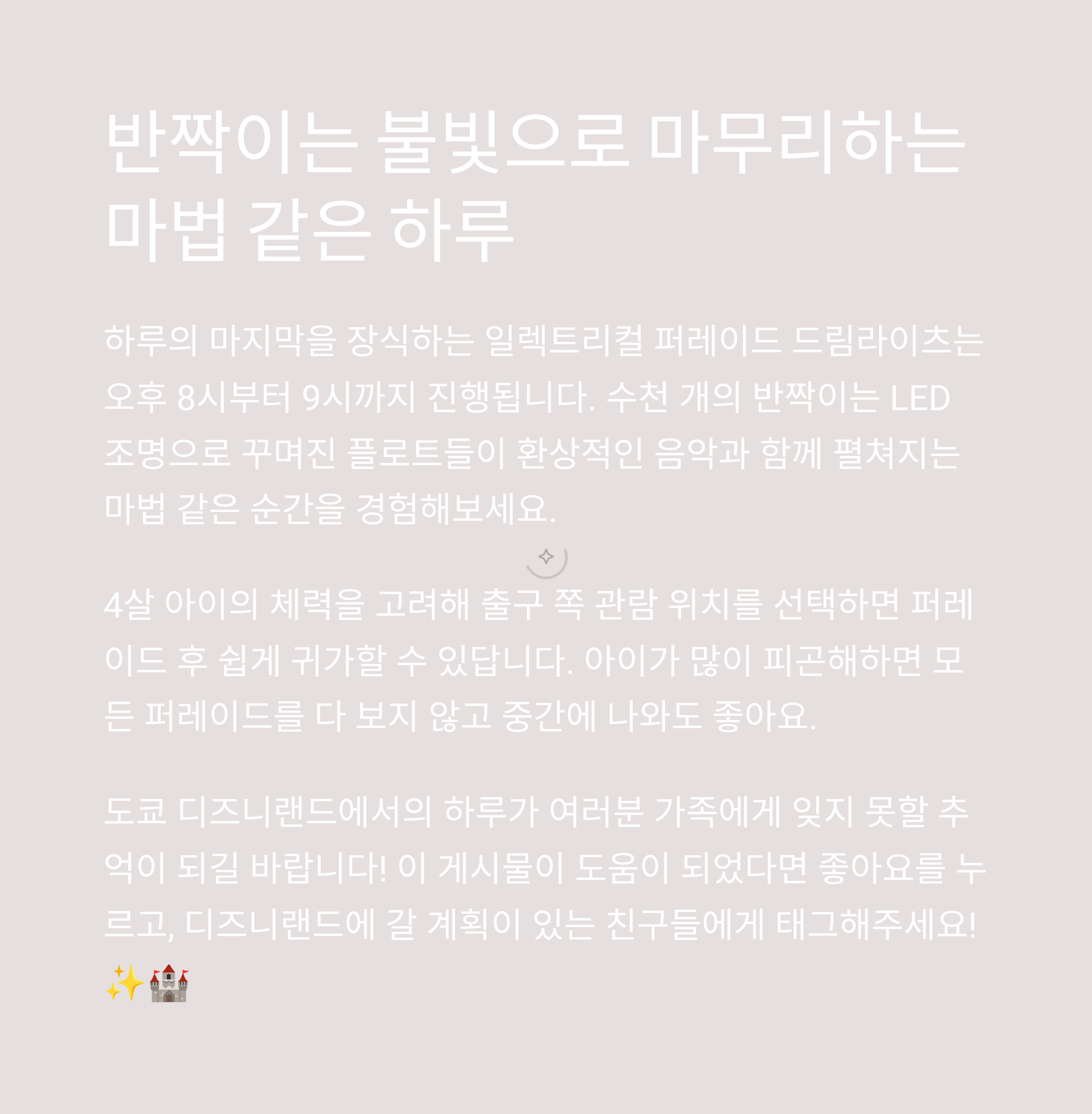 도쿄 디즈니랜드에서의 특별한 하루, 여러분은 어떤 일정을 선택하셨나요? 또는 아이와 함께 다녀온 후기를 공유해주시면 더 많은 부모님께 큰 도움이 됩니다. 댓글로 여러분의 이야기와 꿀팁을 나눠주세요!