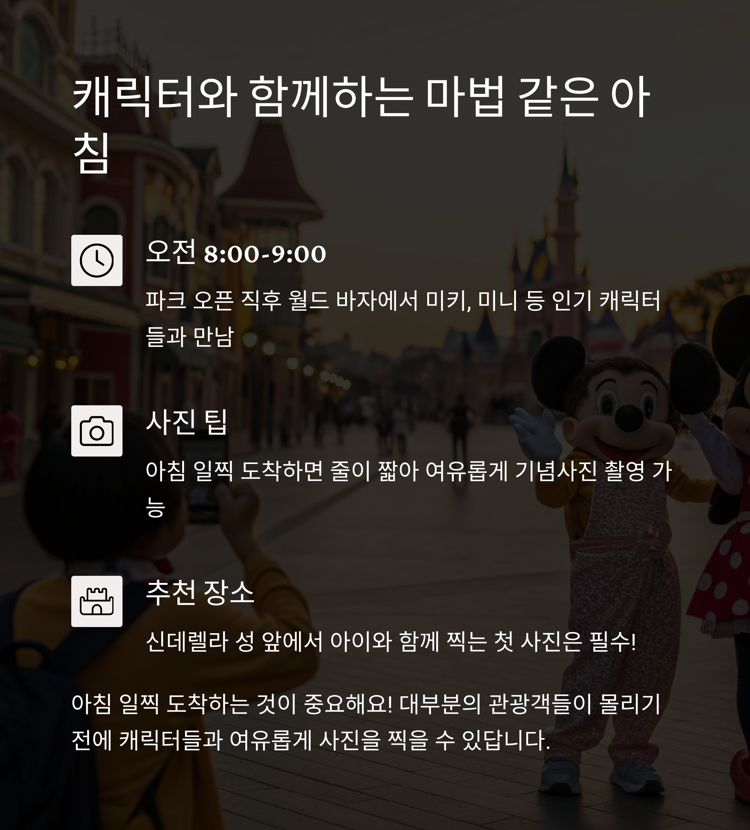 | 대기 시간 짧고 안전한 콘텐츠 위주로 구성 | 아이 식사 메뉴 다양하며 대기 시간 적음 | 퍼레이드 시간 전 30분 이상 여유 있게 자리 확보 |