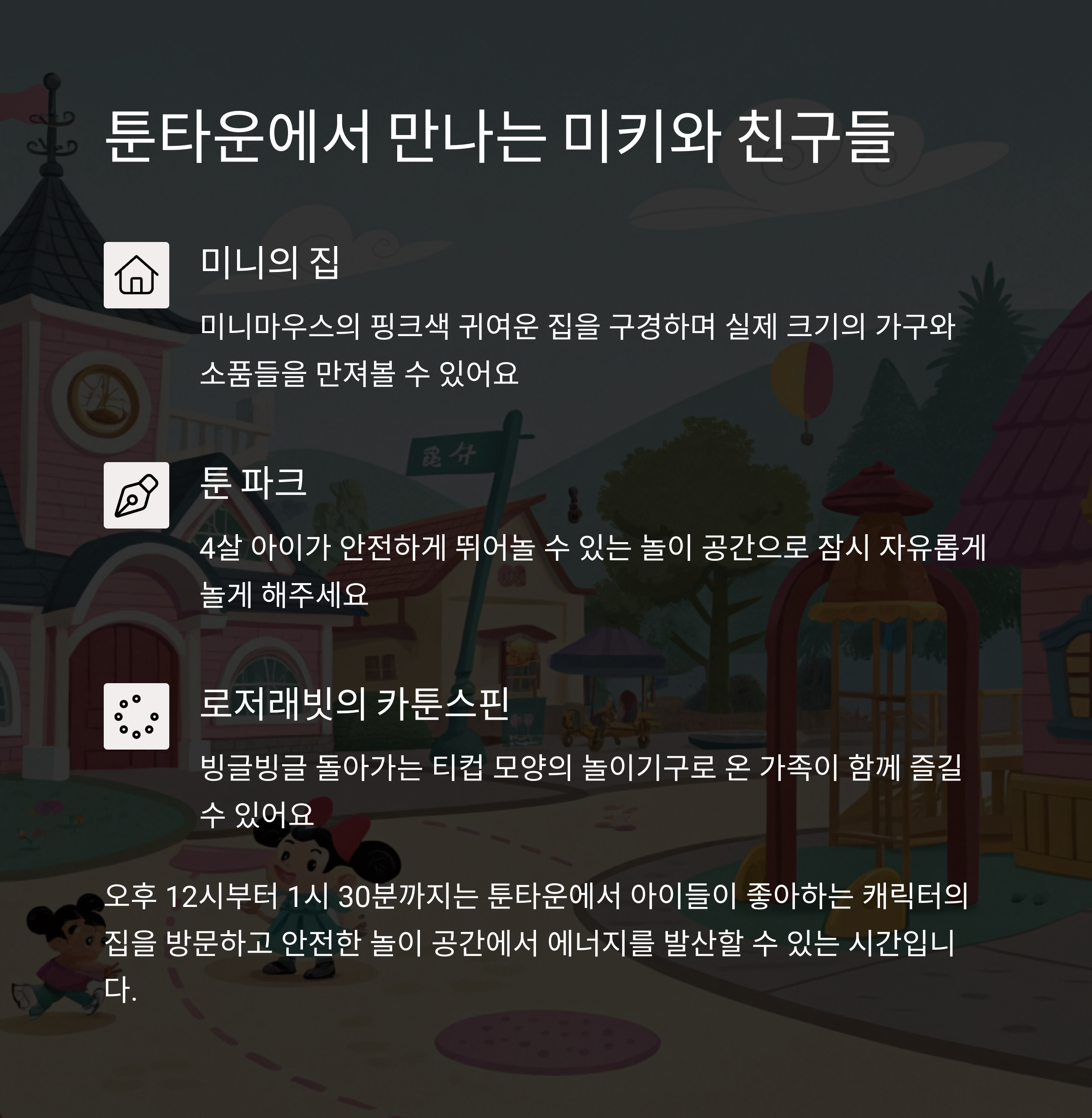 | 어린이 전용 어트랙션 | 기다림이 짧고 자극이 적은 어트랙션을 중심으로 구성 |