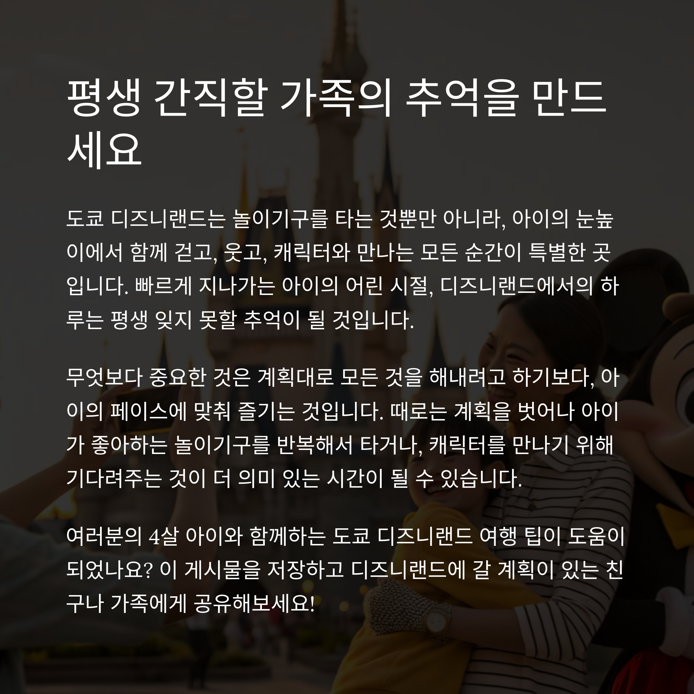 도쿄 디즈니랜드는 단순한 테마파크가 아니라 가족이 함께 소중한 추억을 만드는 특별한 장소입니다. 4살 아이와의 첫 해외 여행이라면 불안함보다는 기대와 설렘으로 가득할 수 있도록 위에서 소개한 팁들을 미리 숙지하고 계획을 세워보세요. 무엇보다 아이의 눈높이에 맞춘 어트랙션과 충분한 휴식, 그리고 유연한 일정 조정이 여행의 즐거움을 좌우할 수 있습니다. 이번 여행이 아이에게는 평생 잊지 못할 첫 마법 같은 기억으로 남기를 바랍니다.