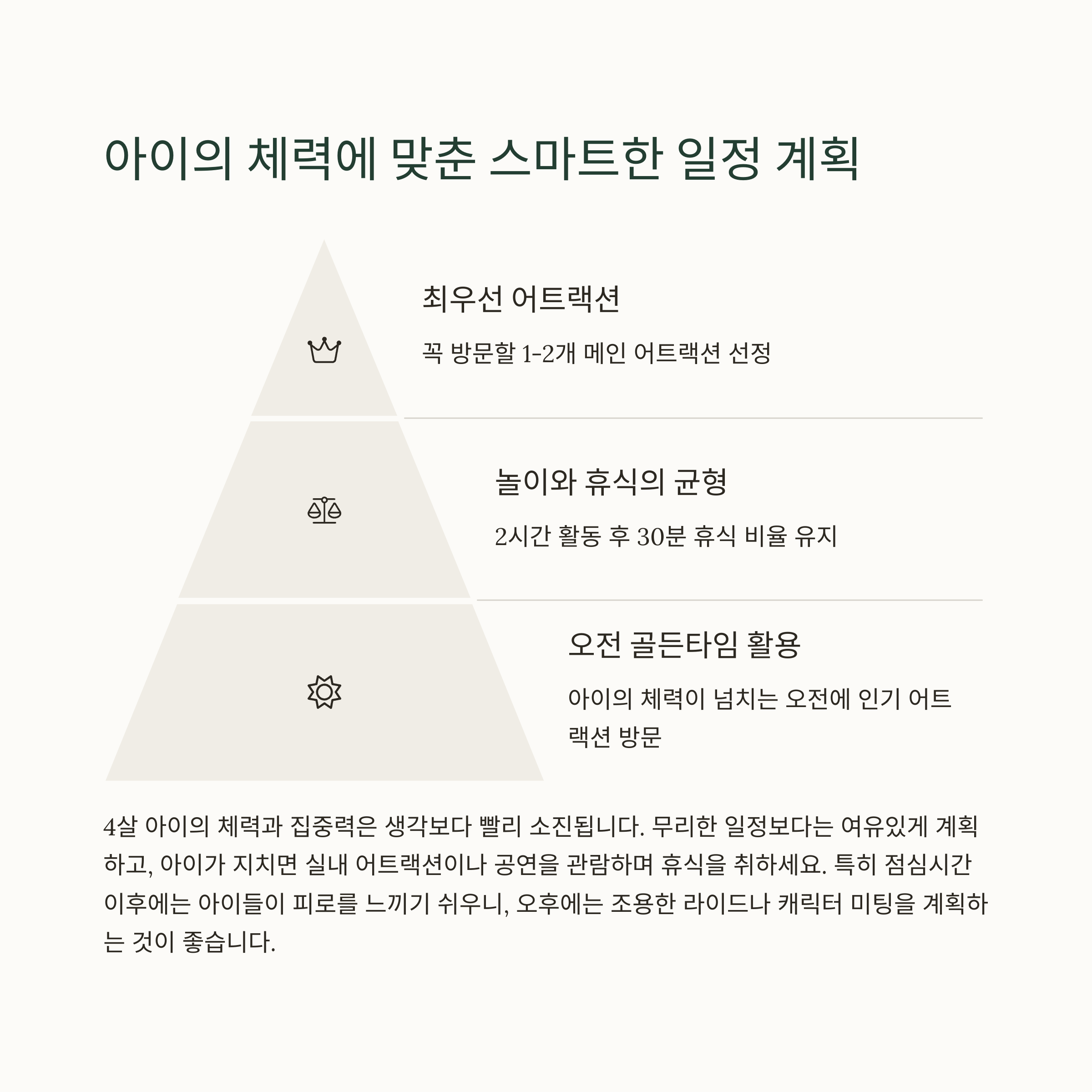 | 스탠바이 패스와 프리미어 액세스 활용 | 아이 중심 체험형 공간으로 구성 | 계절에 따라 선크림과 쿨링 용품도 준비 |