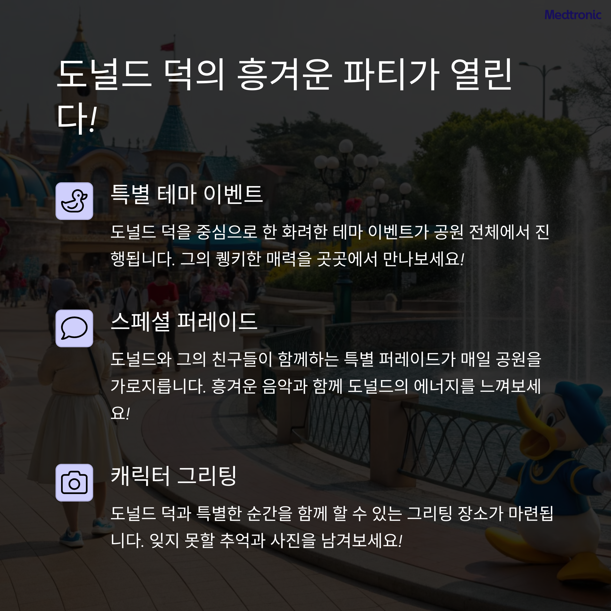 | 도널드가 주인공인 유쾌한 퍼레이드와 장식 | 새로운 캐릭터가 추가된 특별 버전 공개 | 프리미어 액세스로 좋은 자리 확보 가능 |