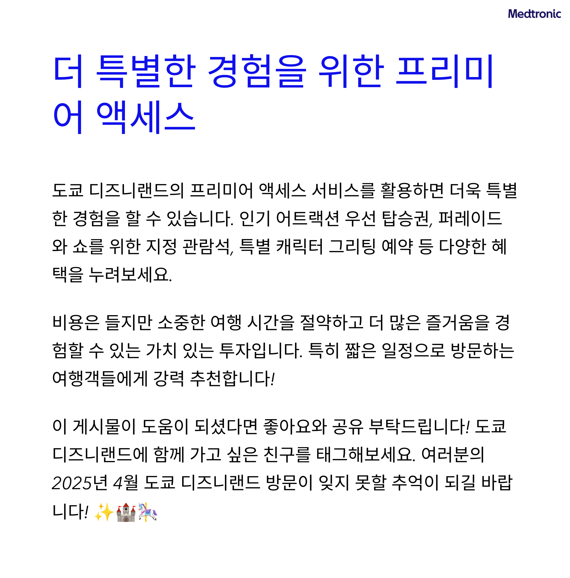 따뜻한 봄바람이 부는 4월, 도쿄 디즈니랜드는 특별한 이벤트와 풍성한 즐길 거리로 가득합니다. 가족, 연인, 친구 누구와 함께해도 완벽한 추억을 만들 수 있는 시기죠. 특히 2025년 4월에는 도널드 덕을 테마로 한 퍼레이드부터 스타워즈와 마블 캐릭터가 등장하는 특별 어트랙션까지, 새로운 매력이 곳곳에 준비되어 있어 방문객들에게 더욱 특별한 경험을 선사합니다. 이번 블로그에서는 4월 한정으로 진행되는 주요 행사, 공연과 퍼레이드, 추천 먹거리와 굿즈, 그리고 효율적인 방문 팁까지 꼼꼼히 정리해 드릴 예정이에요. 도쿄 디즈니랜드 여행을 계획 중이라면 꼭 끝까지 읽어보시고, 알차고 현명한 일정 구성에 도움 받으시길 바랍니다. 지금부터 마법 같은 4월의 디즈니랜드 이야기, 함께 떠나볼까요?