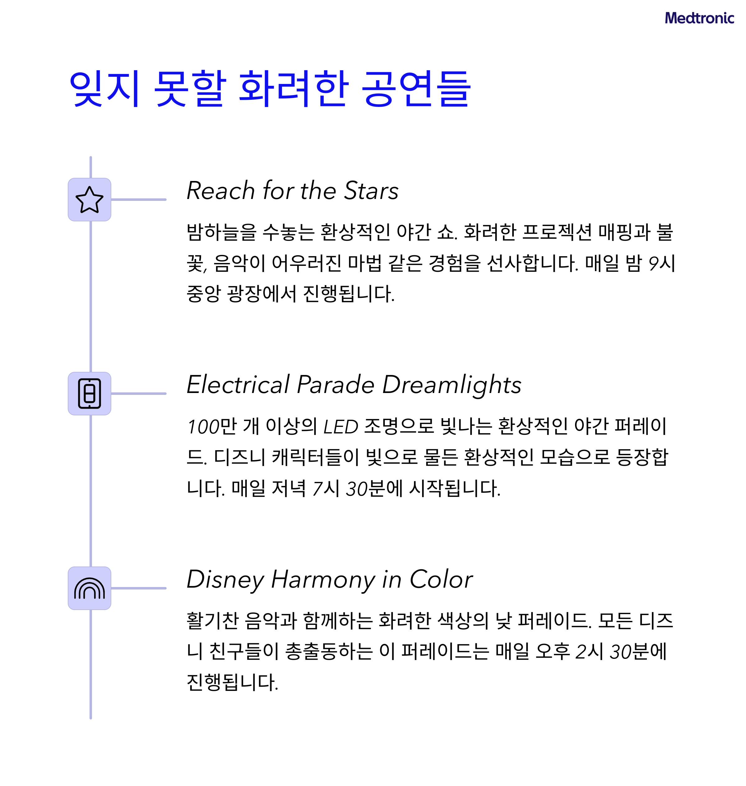 공연과 퍼레이드 역시 놓칠 수 없습니다. 밤하늘을 수놓는 'Reach for the Stars'는 음악, 조명, 그리고 감동적인 연출이 어우러져 보는 이들에게 깊은 인상을 남깁니다. 여기에 전통적인 야간 퍼레이드인 'Electrical Parade Dreamlights'와 낮 시간대의 'Disney Harmony in Color'는 디즈니의 대표 캐릭터들이 총출동하여 동화 같은 장면을 연출합니다. 특히 프리미어 액세스를 활용하면 인기 공연을 좋은 자리에서 편하게 즐길 수 있어 많은 방문객들이 사전에 예약하고 있습니다.