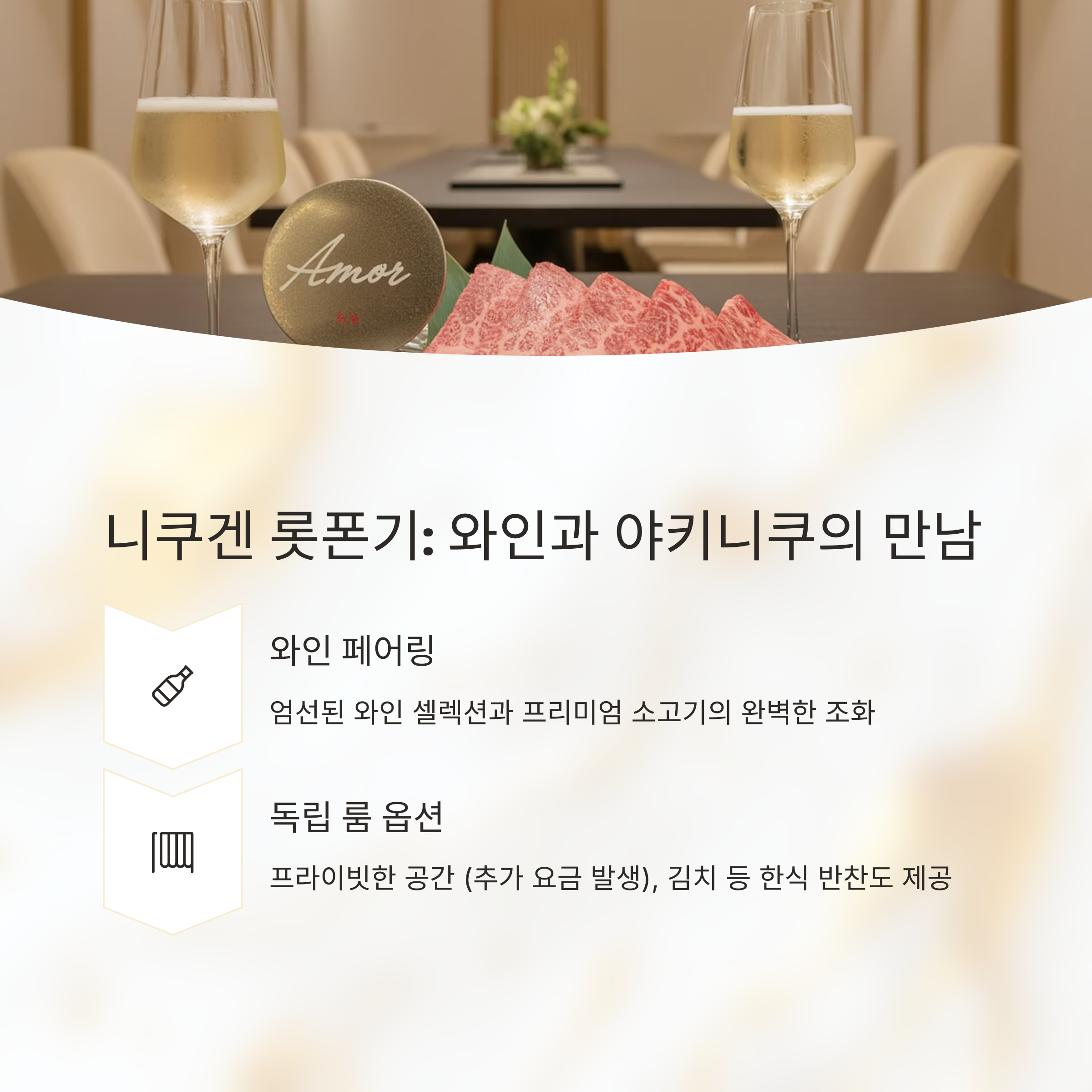 또 다른 추천 장소는 니쿠겐 롯본기점으로, 인기 와인과 고급 야키니쿠를 즐길 수 있는 곳으로 유명합니다.